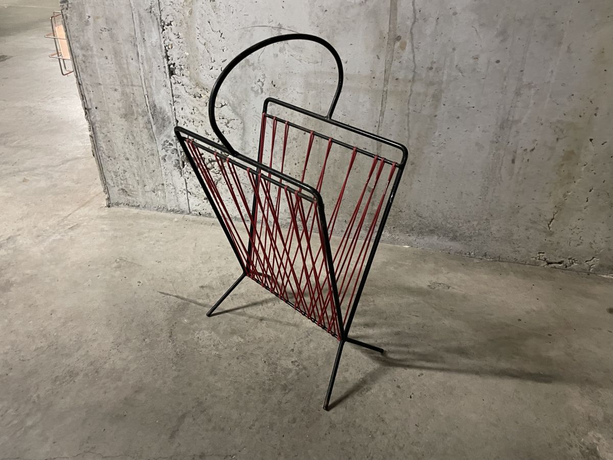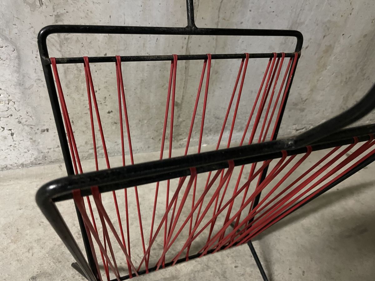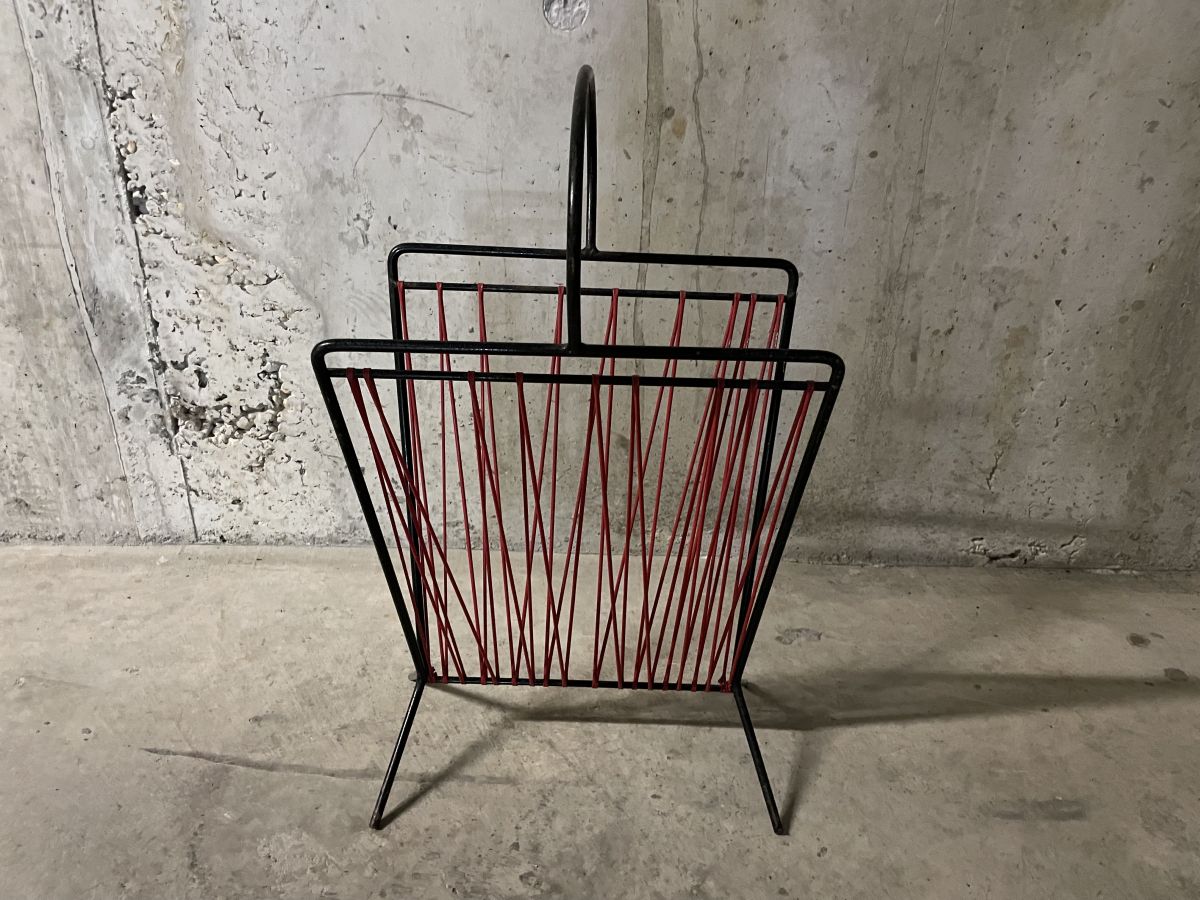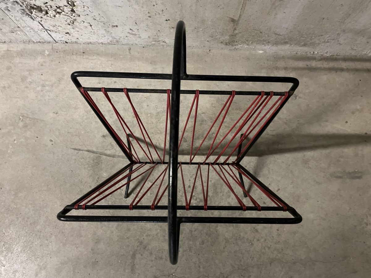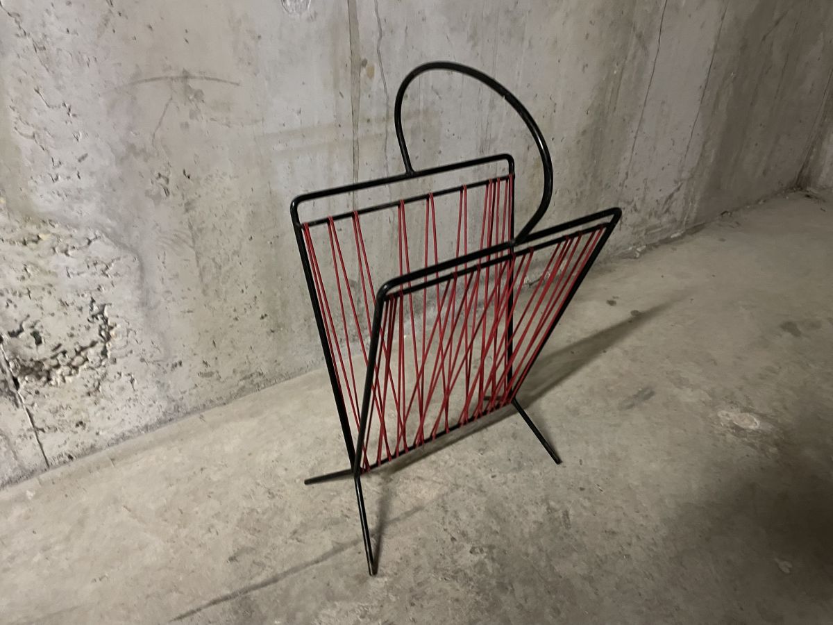 Porte-revues en métal noir des années 60, scoubidou rouge, légères traces d’usage (voir photos), dimensions (cm) : L.35xH.60xP.27, bon état.