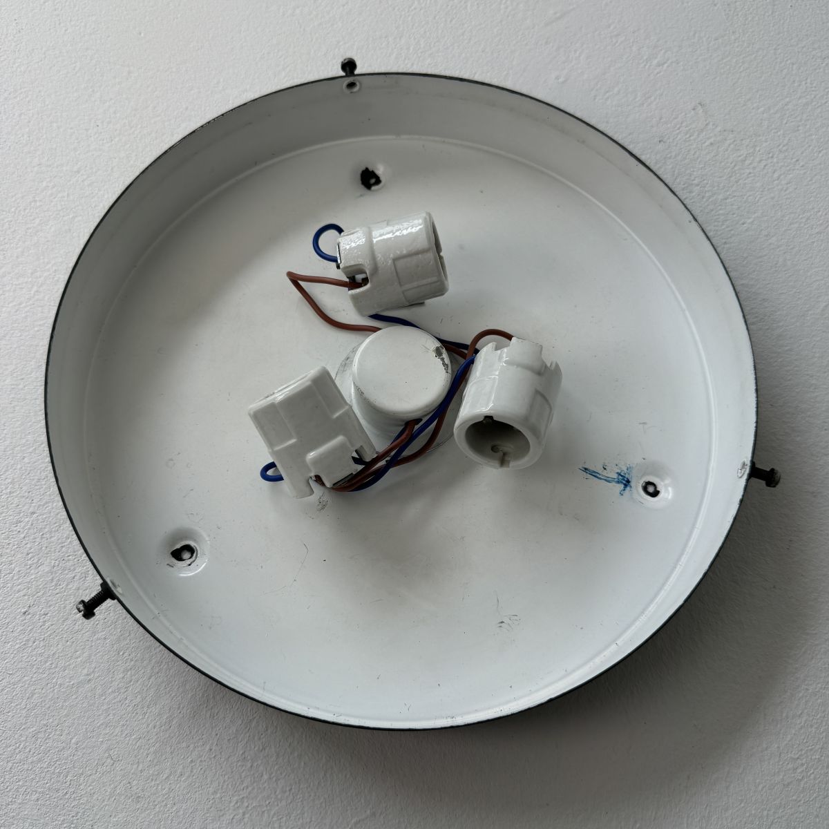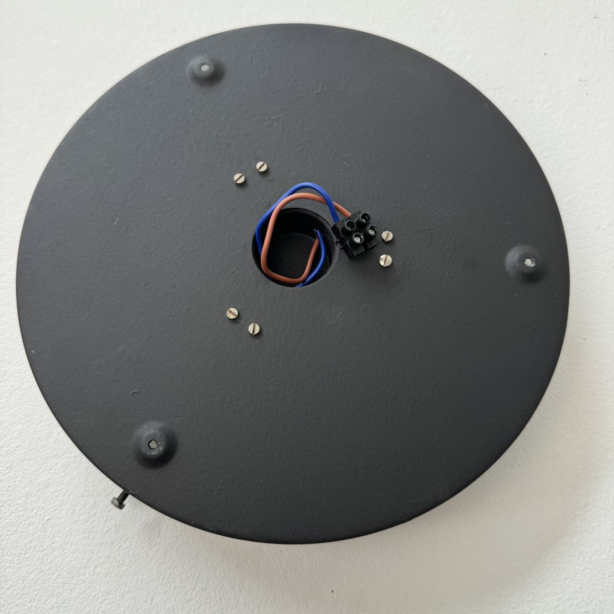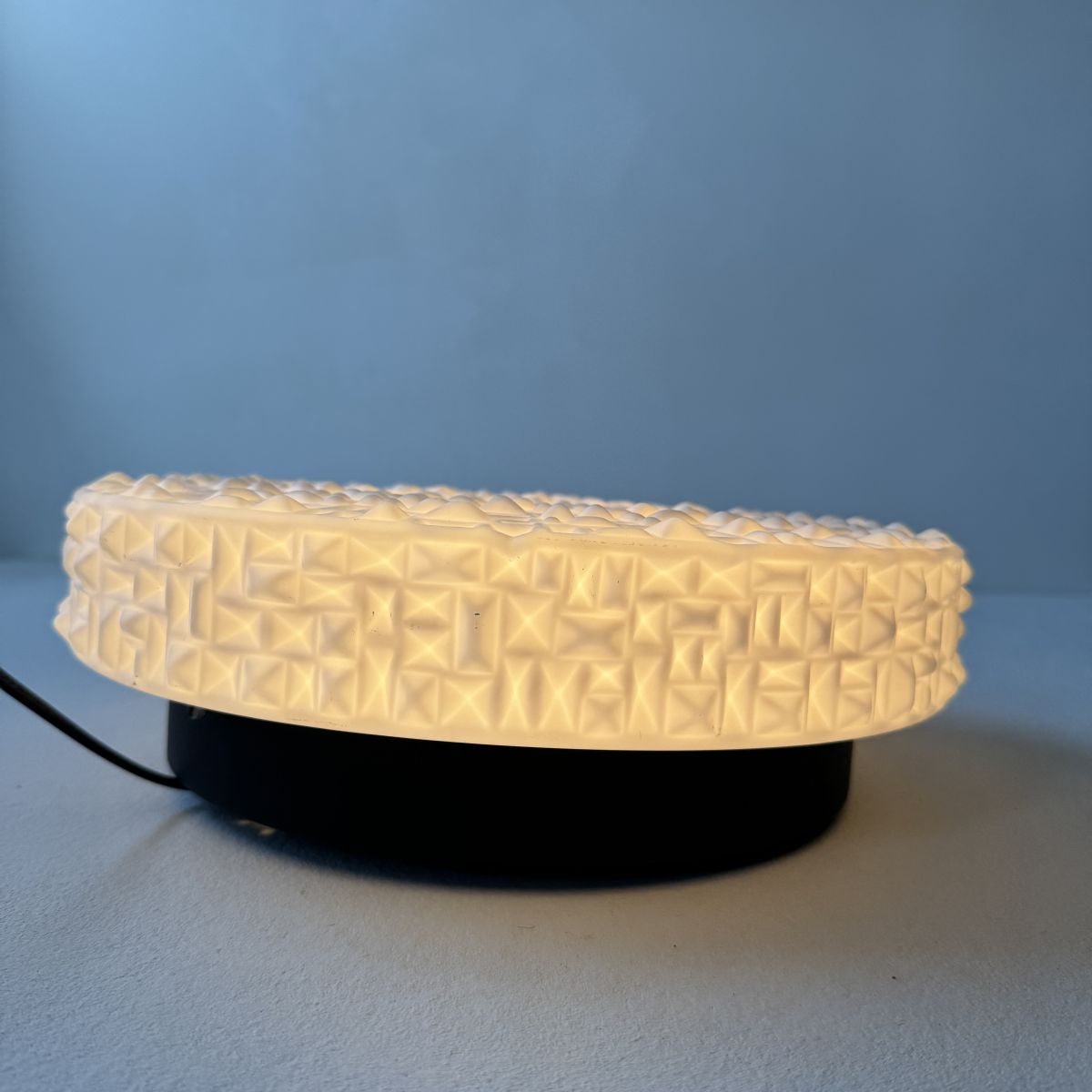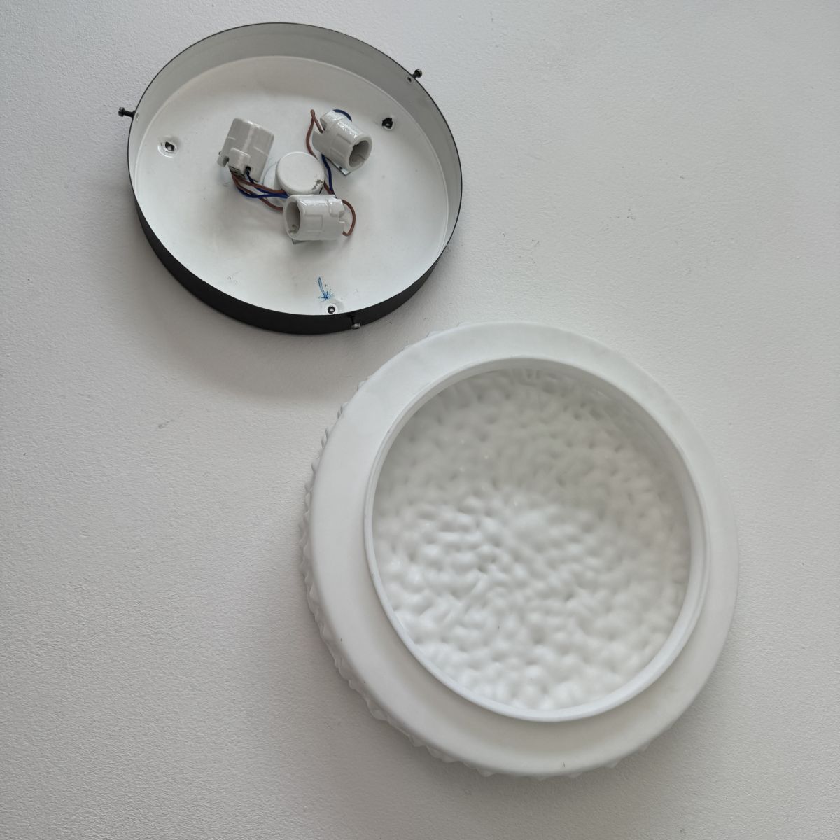 Rare et superbe grande applique ronde en opaline texturée. La base en métal a été repeinte en noir avec peinture haute température. Très belle lumière.