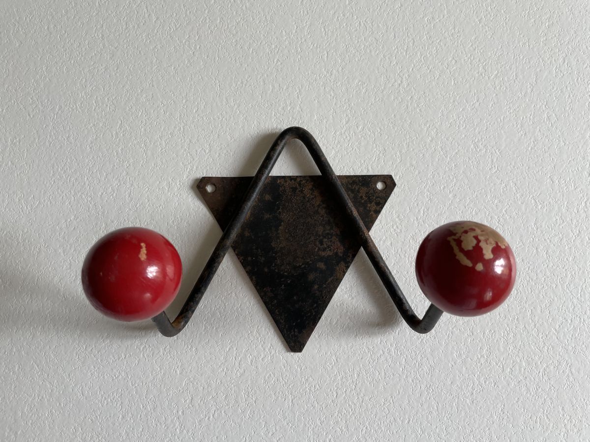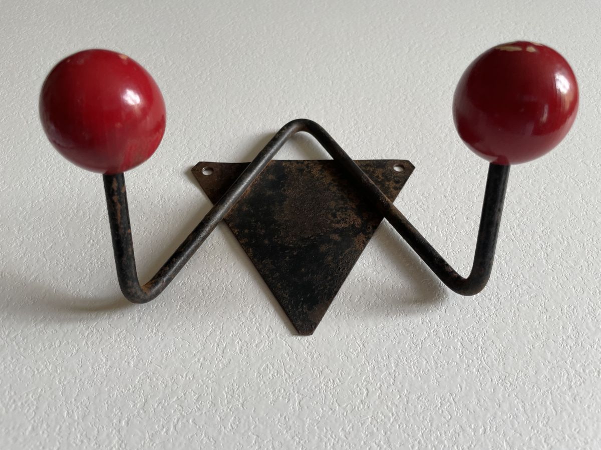 Patère 2 boules rouges en bois et métal noir des années 50,quelques traces d’usage sur les boules et la structure (voir photos), dimensions (cm) : L.17xH.13xP.10.