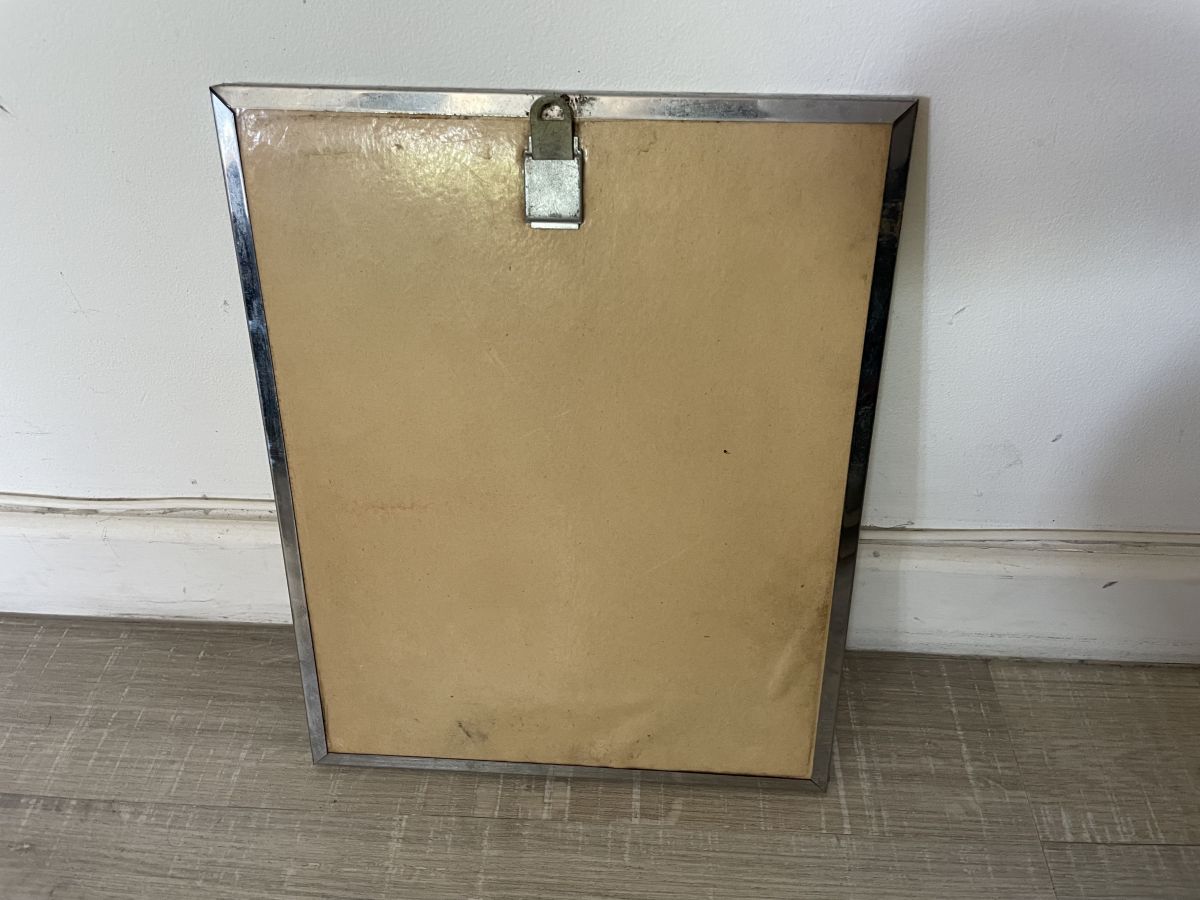 Miroir de coiffeur à suspendre des années 60 en métal chromé et dos cartonné, dimensions (cm) : L.24xH.30xP.1, bon état.