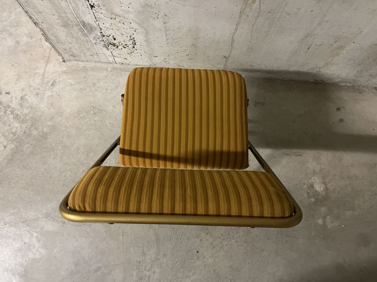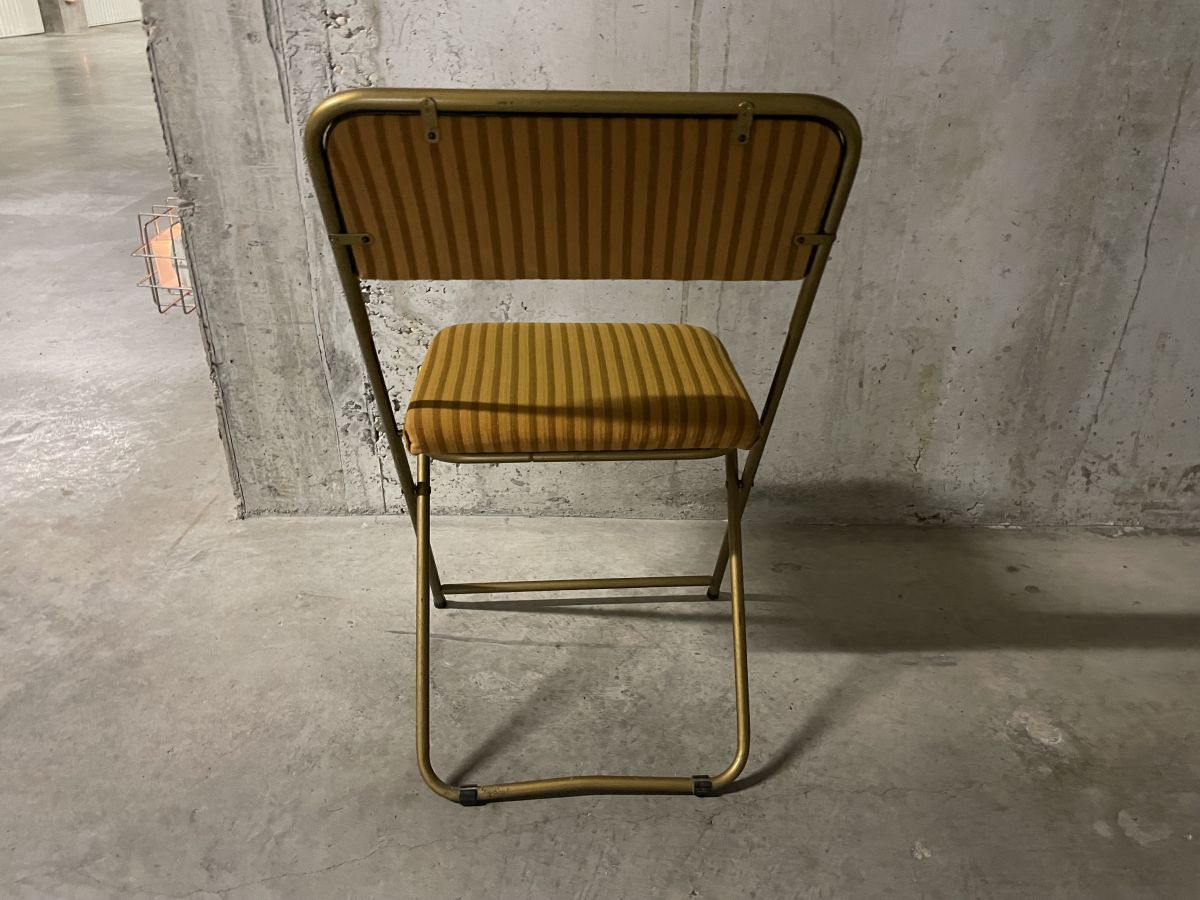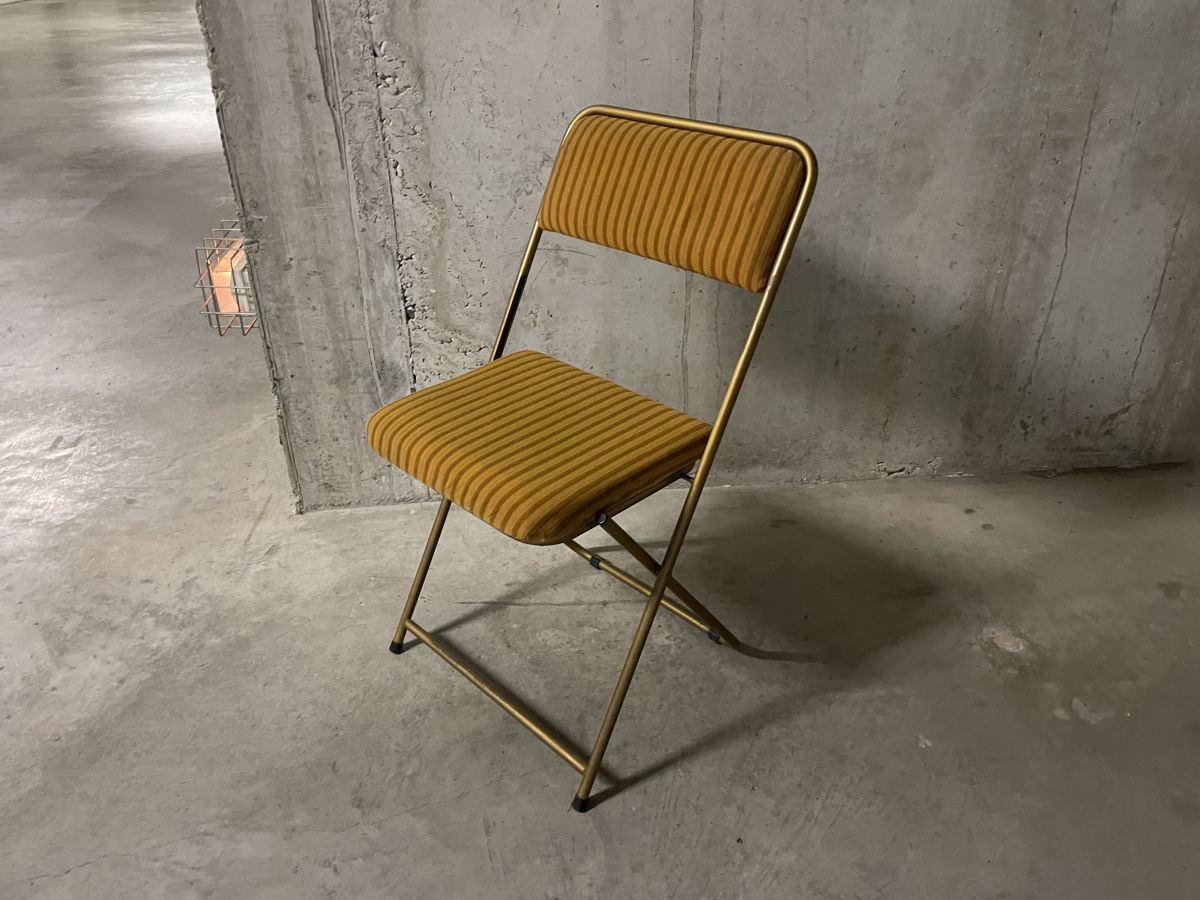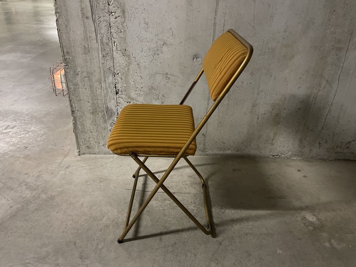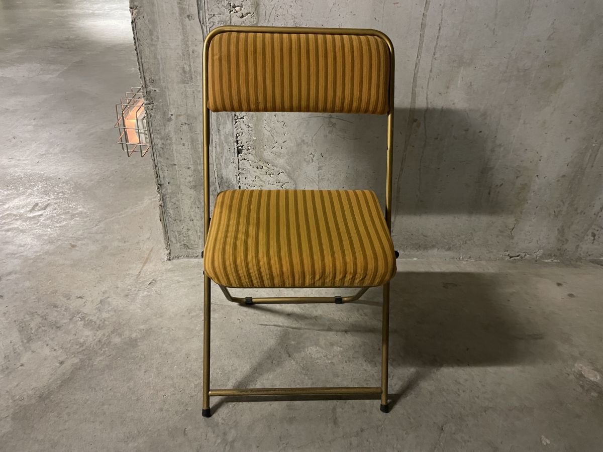 Chaise pliante de marque Lafuma des années 70 (étiquette originale), tissu jaune moutarde (très bon état), métal tubulaire doré (quelques traces d’usage), dimensions (cm) : L.45xH.80xP.7(pliée), hauteur assise 46cm, assise 38x33cm, bon état.