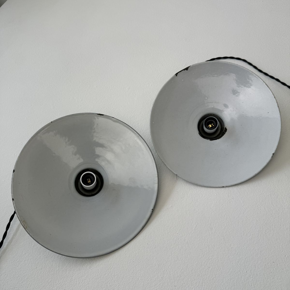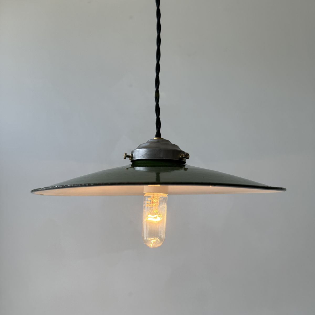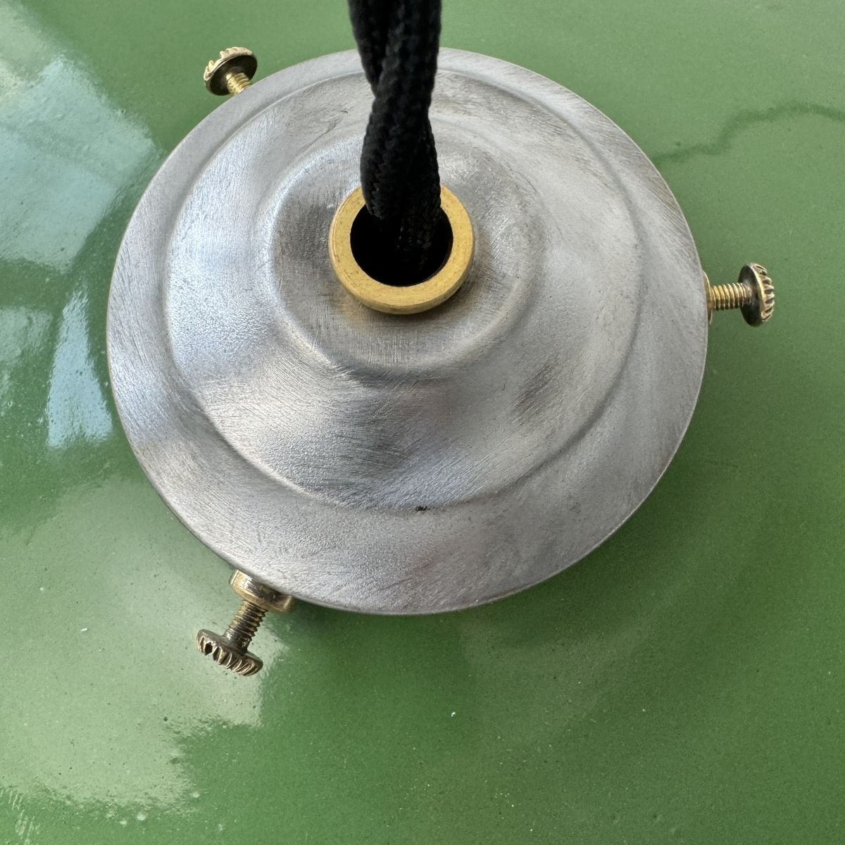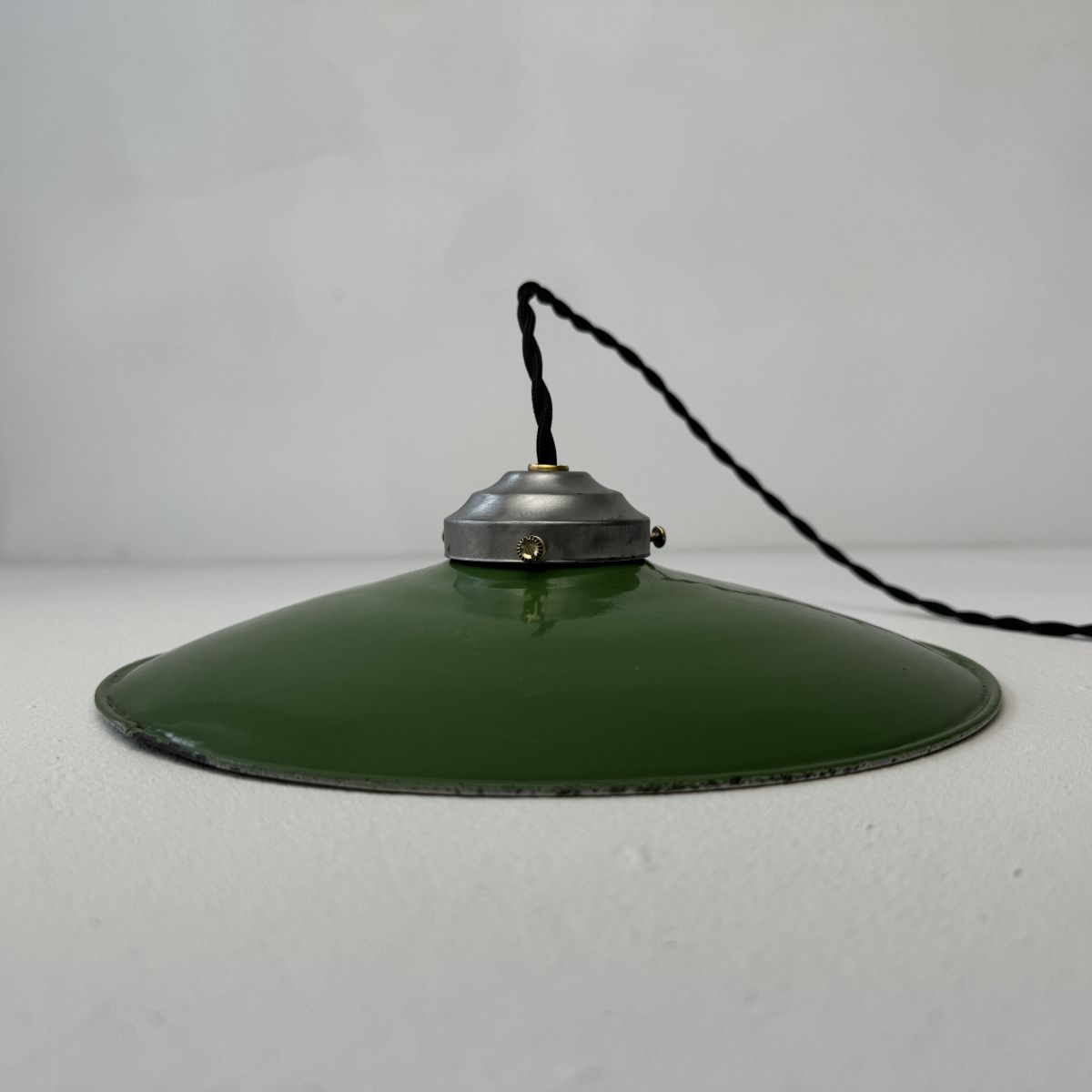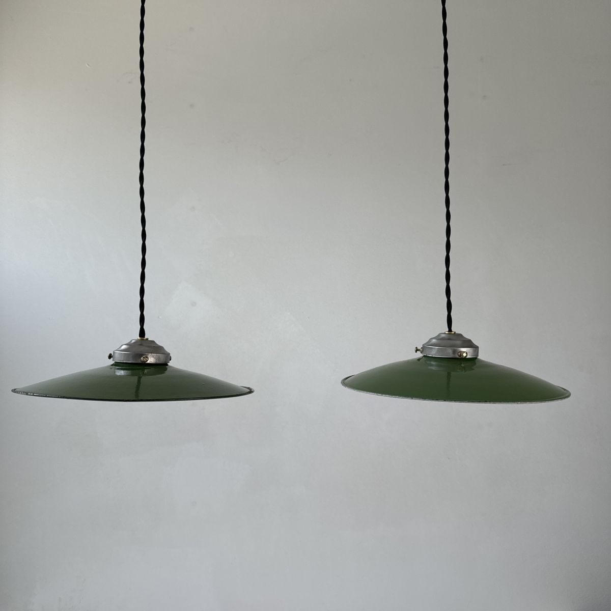 Lot de 2 suspensions en tôle émaillée plates. Vertes. Quelques sauts d’émail et points de rouille dus à leur passé industriel
