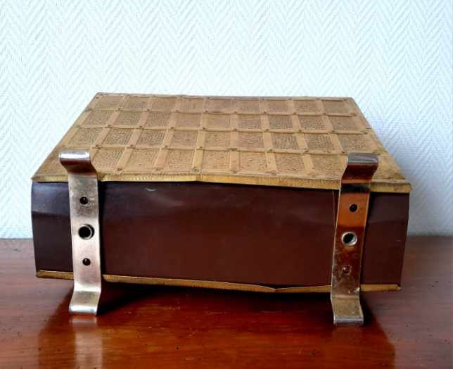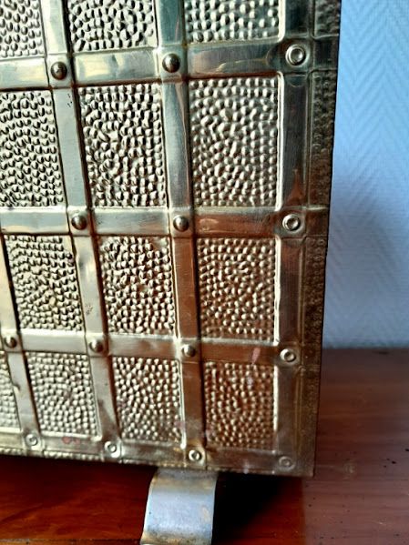 Porte-revues en laiton repoussé sur l'extérieur avec un motif quadrillé style coffre à l'ancienne. A l'intérieur, métal laqué marron. Travail par le fabricant anglais Peerage Brass à Birmingham (producteur d'articles en cuir et laiton), non signé.