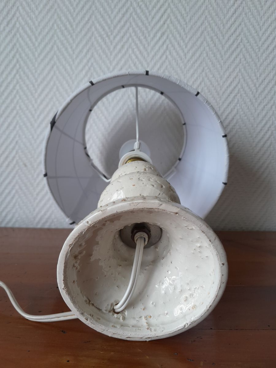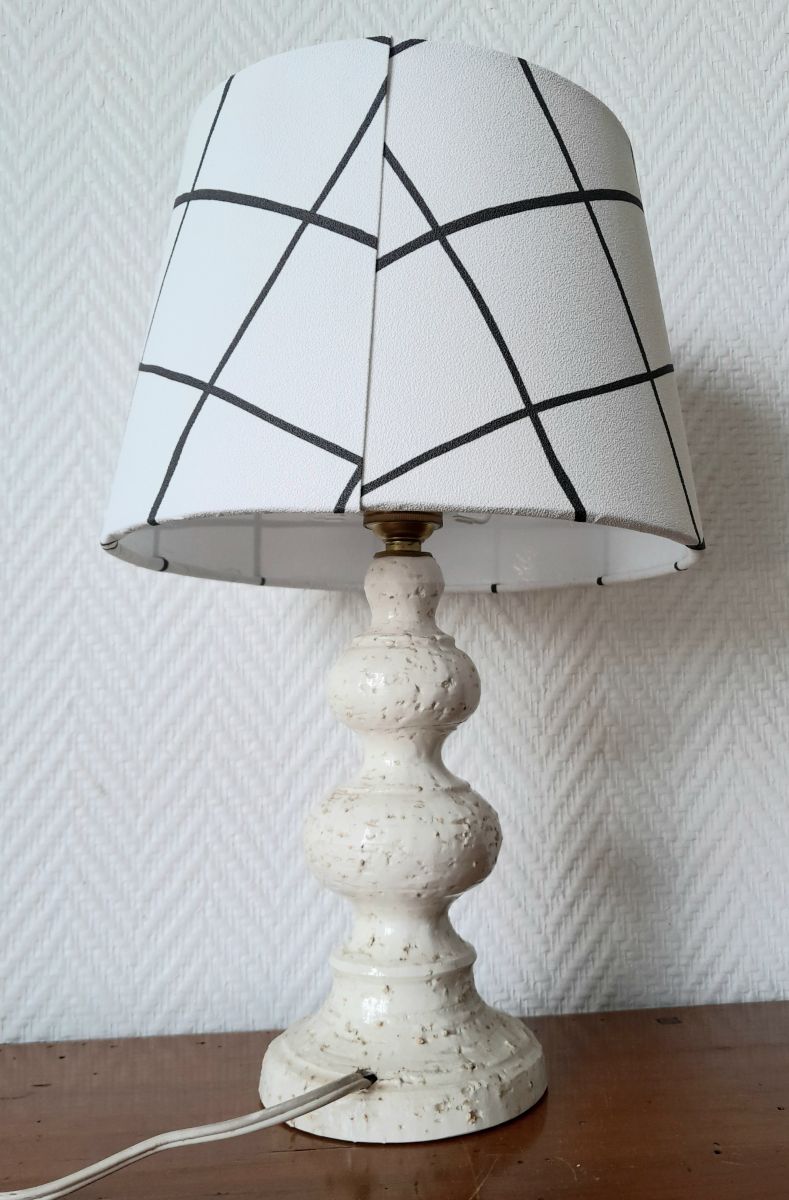 Pied de lampe en céramique émaillée blanche, effet texturé brutaliste, monté à l'électricité avec abat jour sur mesure.