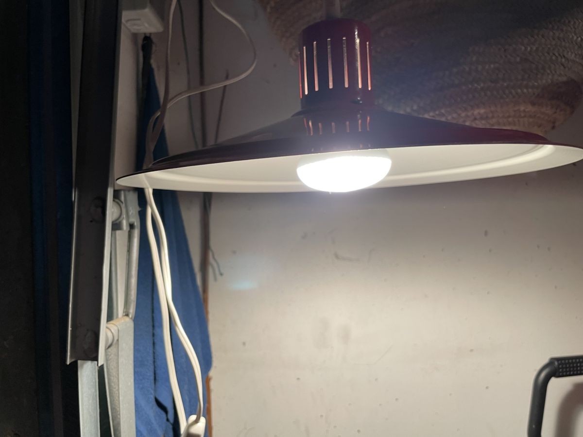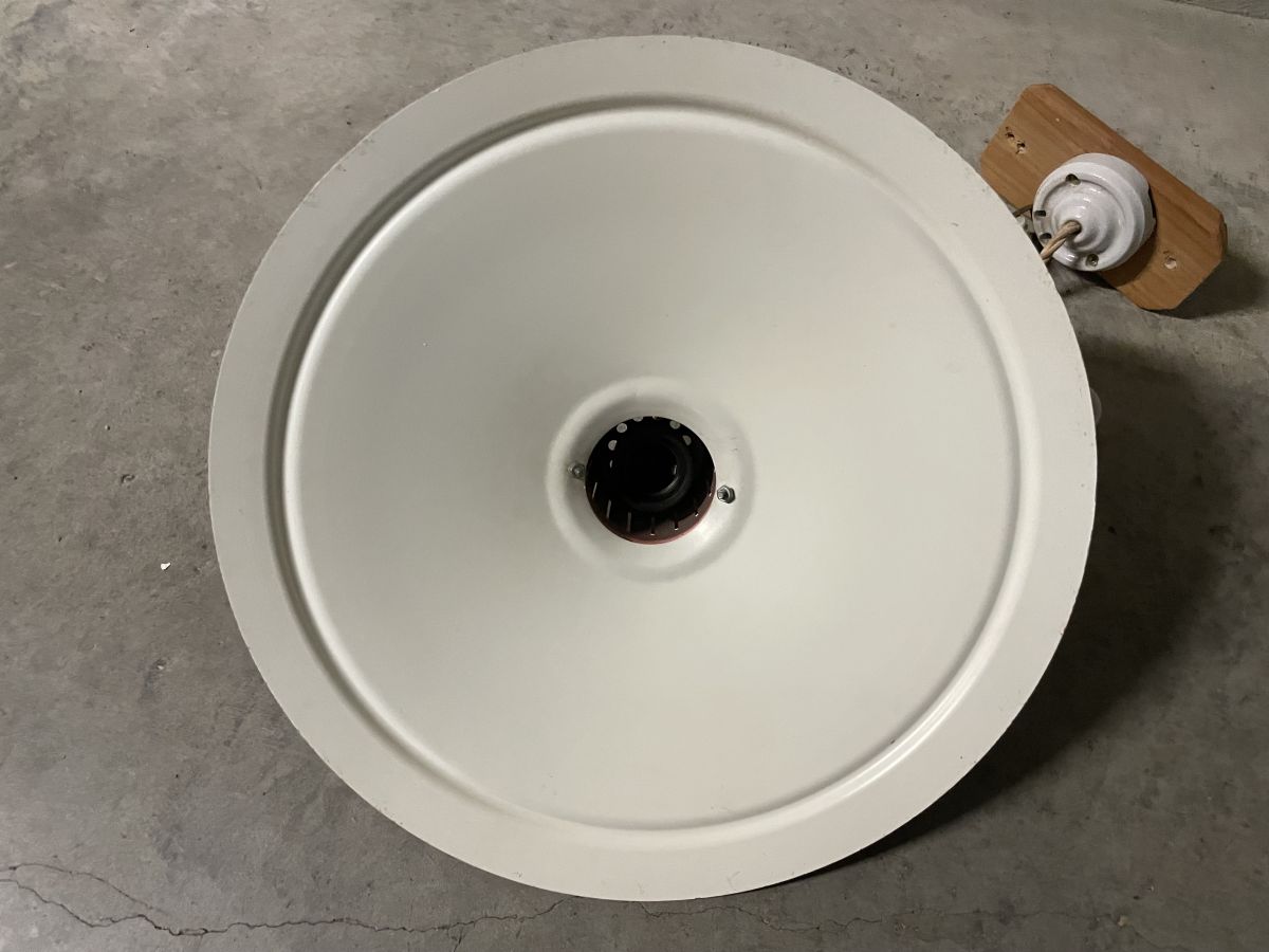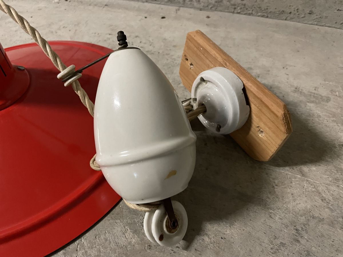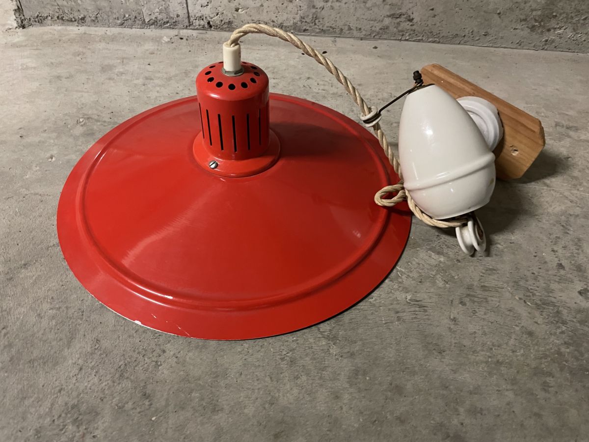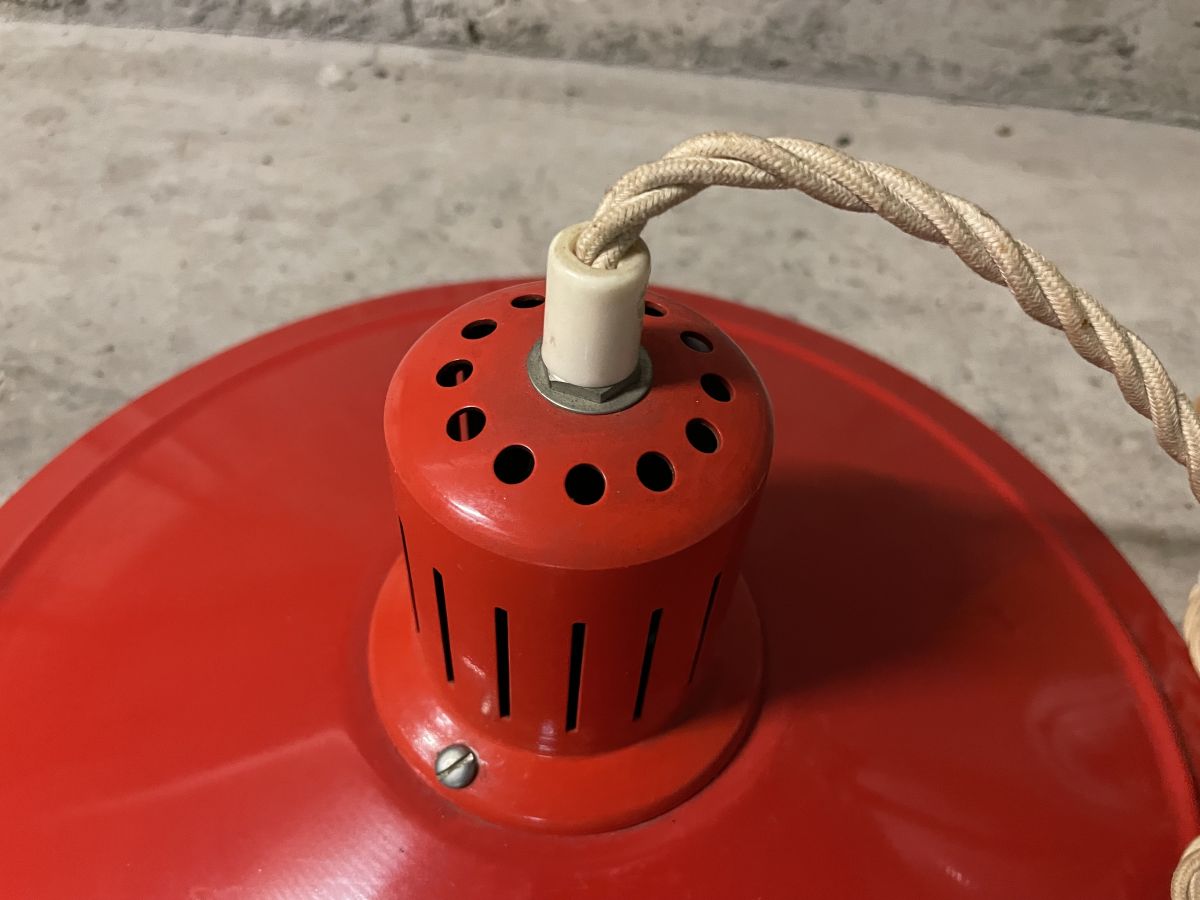 Suspension monte et baisse des années 60, abat-jour en métal rouge orangé, ampoule vissée de type e27, diamètre 36cm, hauteur 13cm, poulie en porcelaine, fil en tissu, fonctionne parfaitement, bon état.