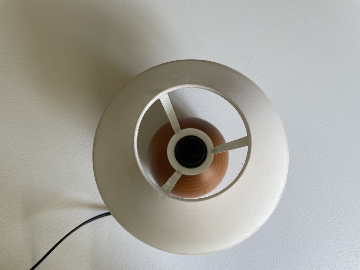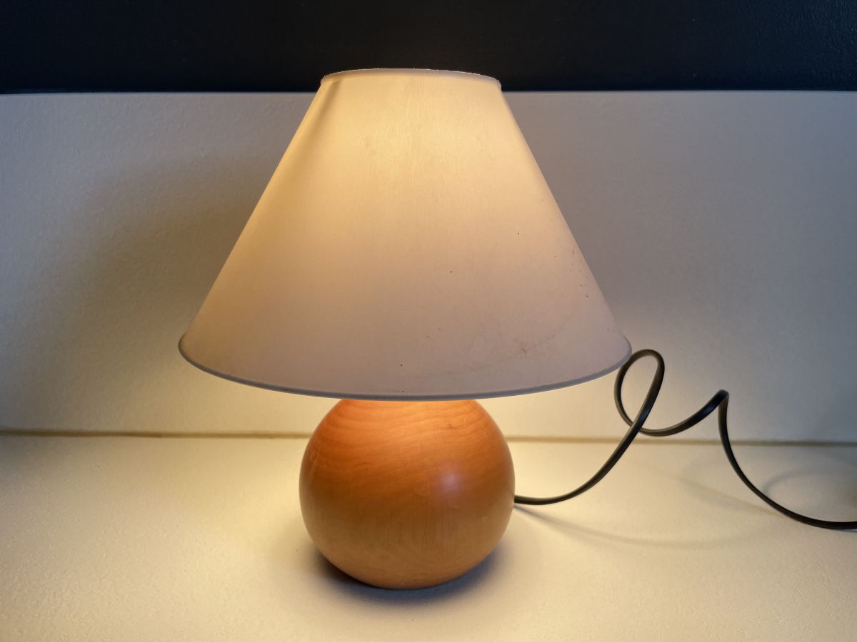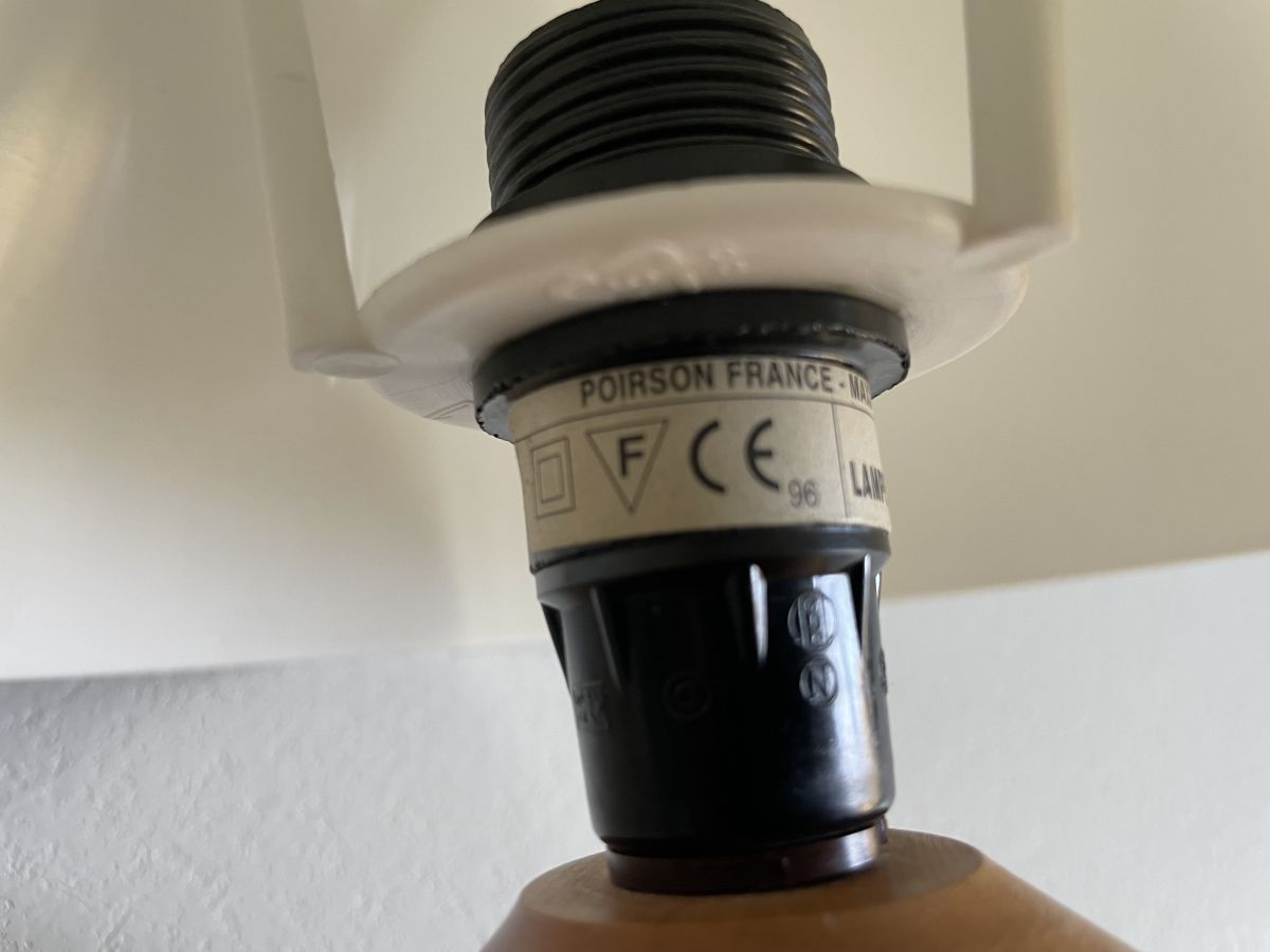 Lampe boule à poser en bois massif clair des années 70, de la marque française Poirson (made in France), abat-jour en tissu blanc, hauteur 24cm, diamètre socle 11cm, diamètre abat-jour 22cm, bon état.