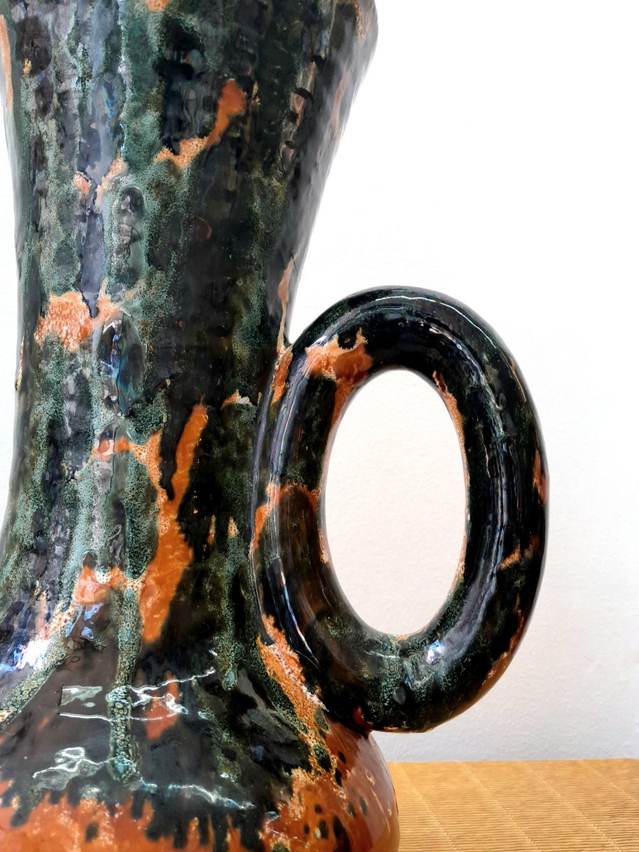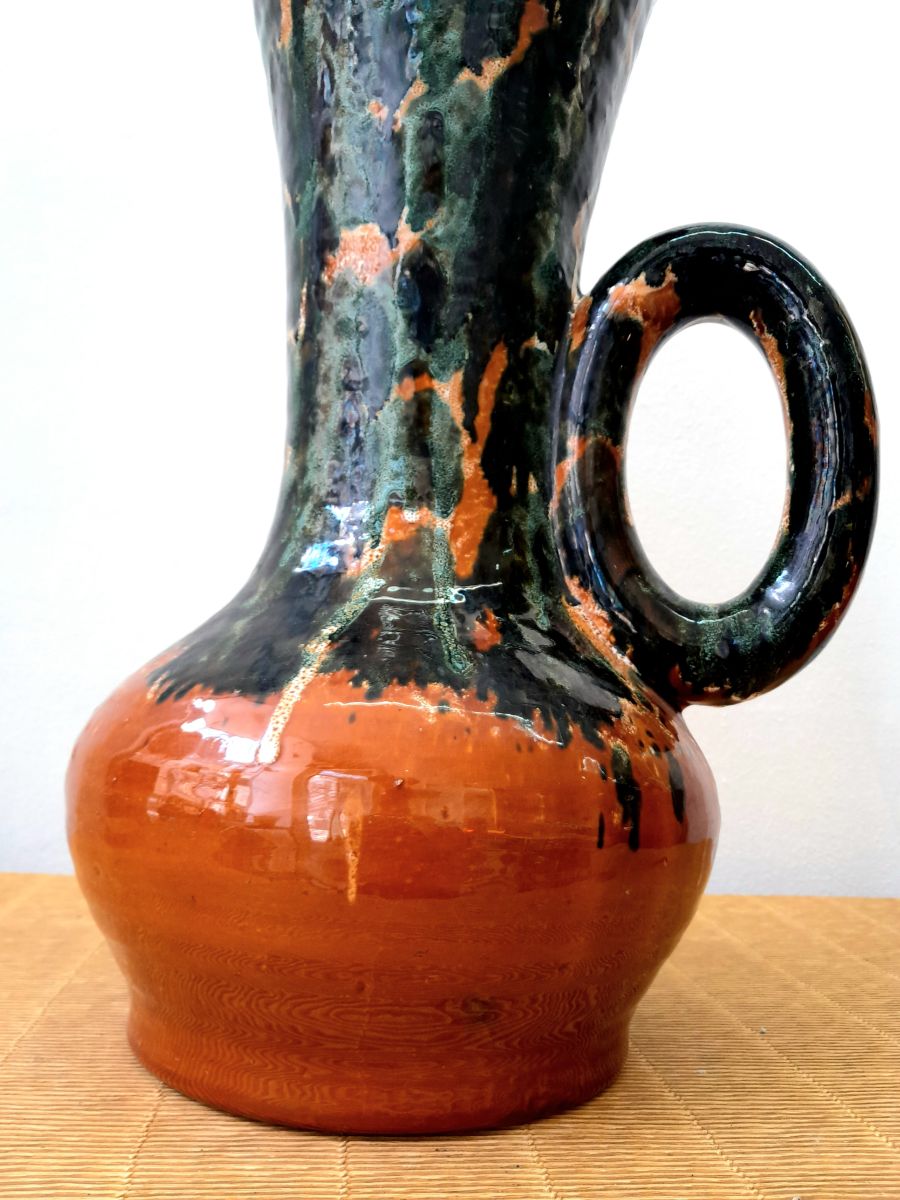Vase de sol en céramique émaillé dans les tons orangés à coulures vertes. Grande anse ronde donnant un superbe look vintage à cette pièce.