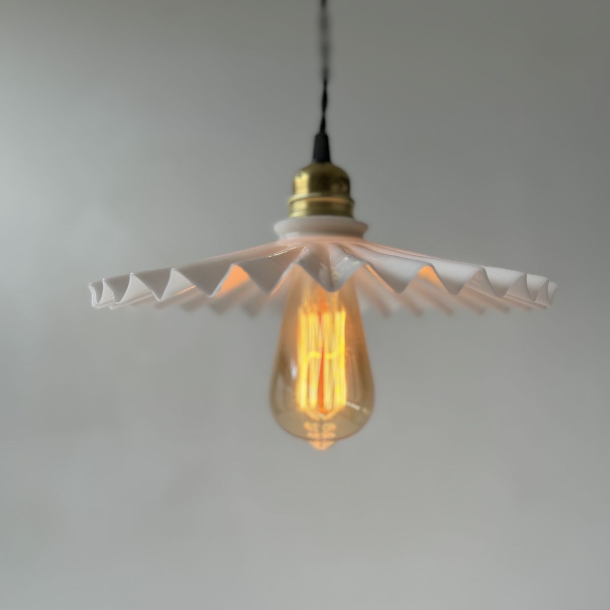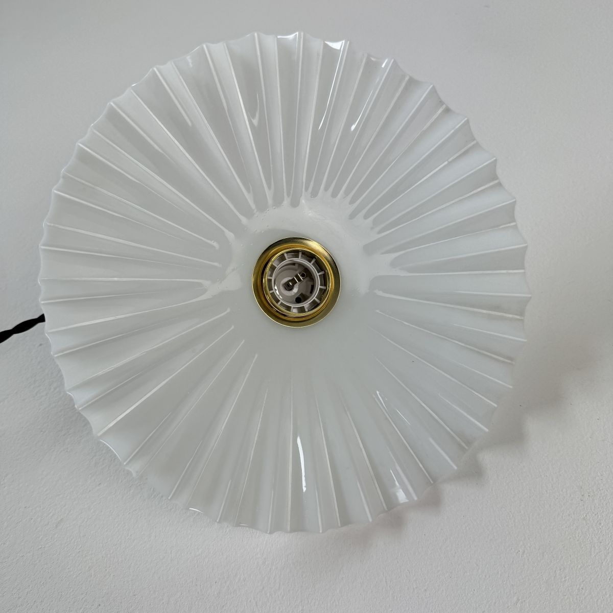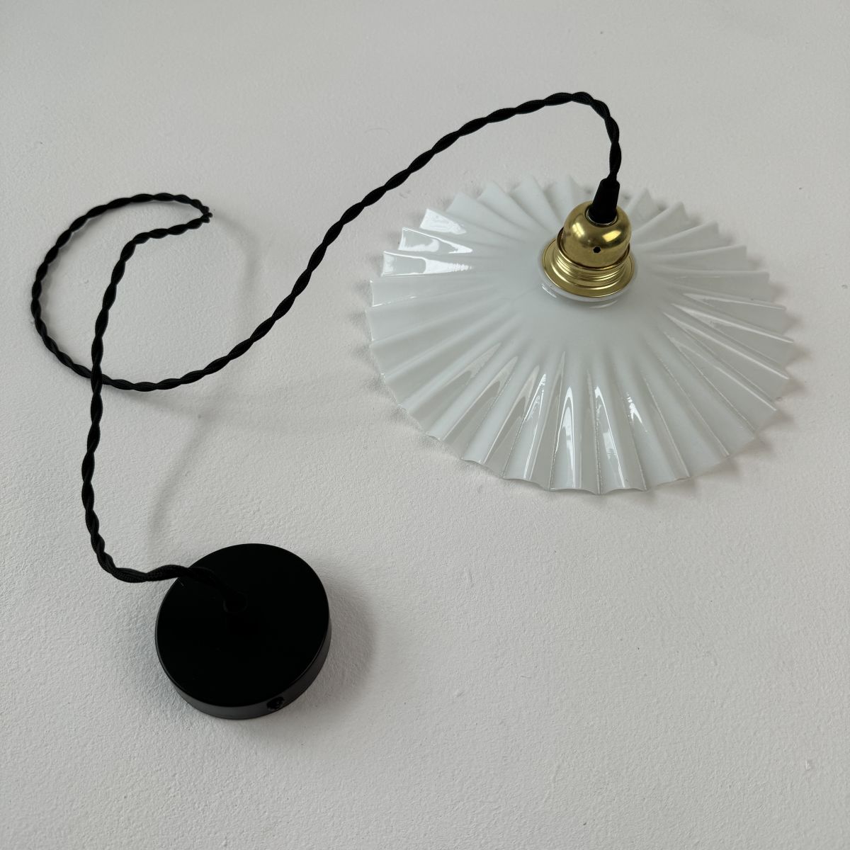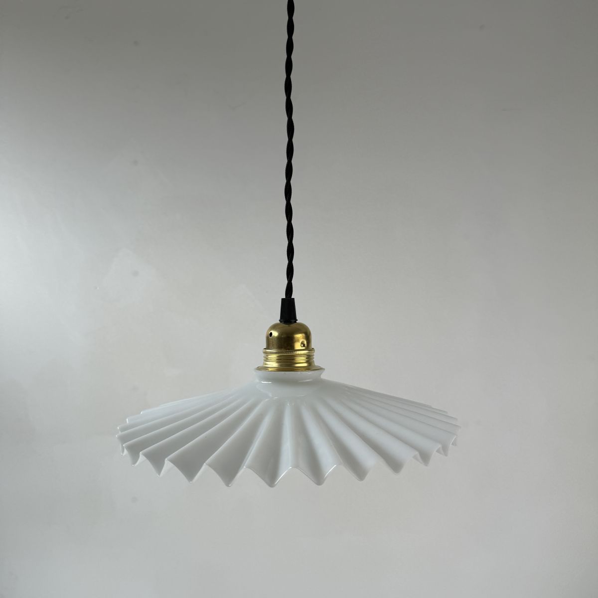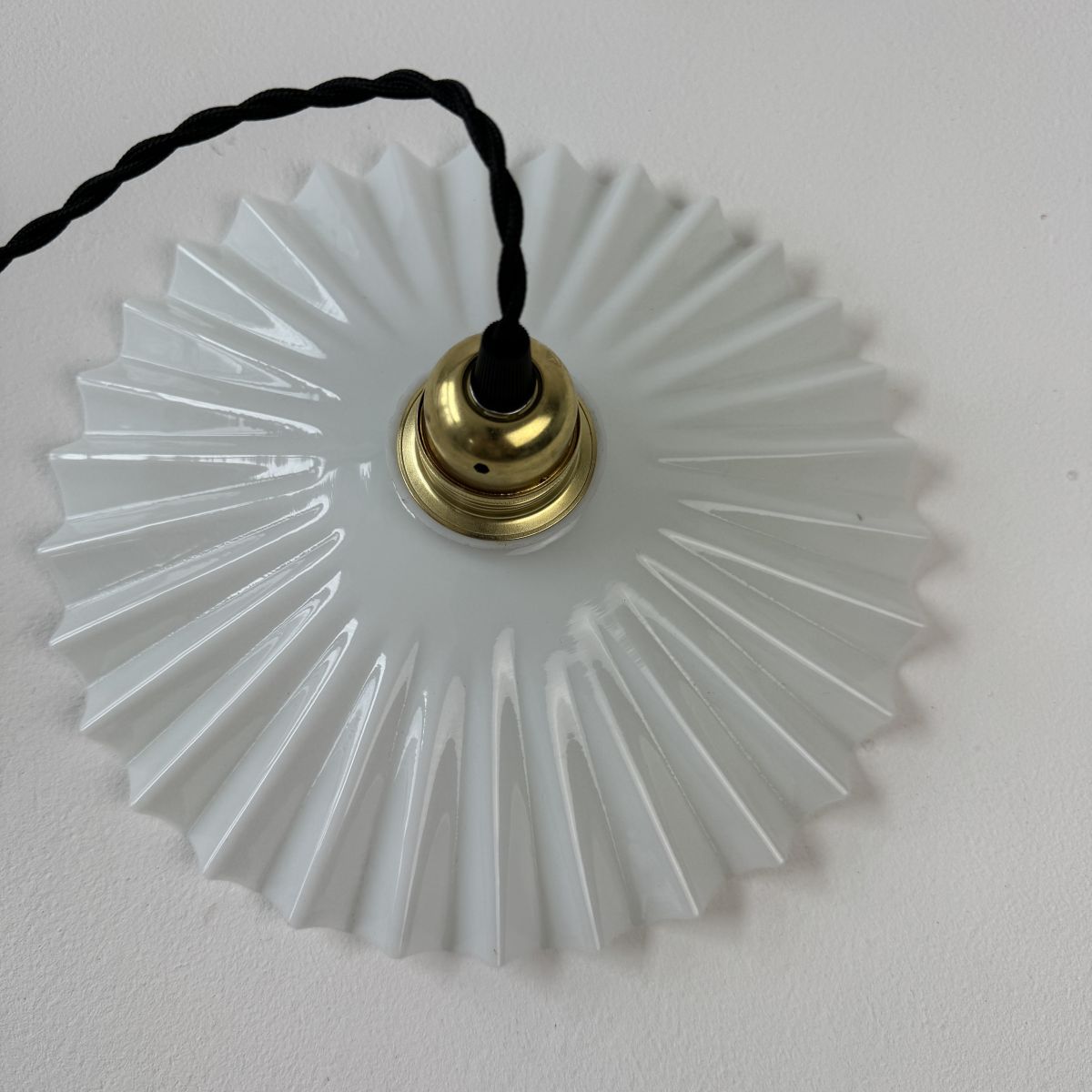 Ancienne suspension vintage en opaline juponnée. Belle lumière. Quelques traces du temps.