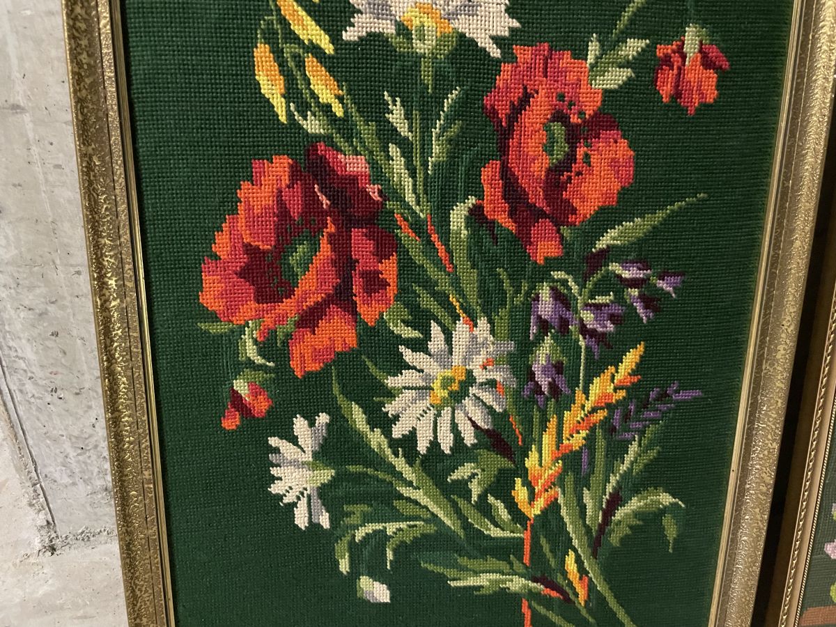 Paire de canevas représentant des fleurs dans un vase, grand cadre 55x41cm, petit 49x38cm, très bon état.