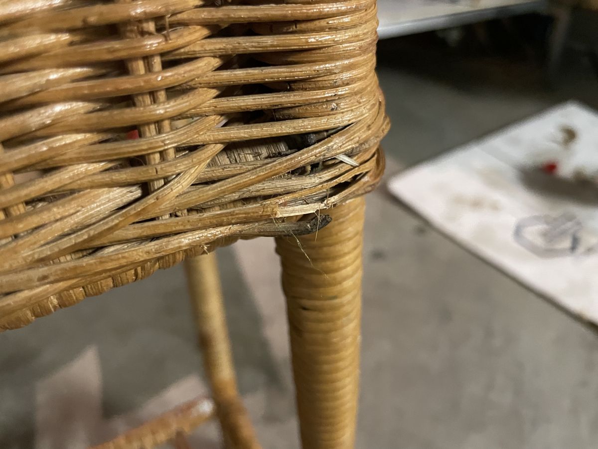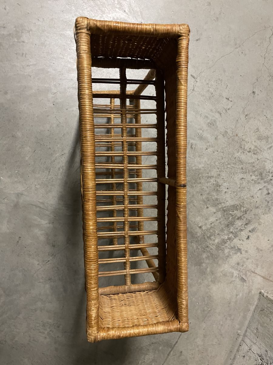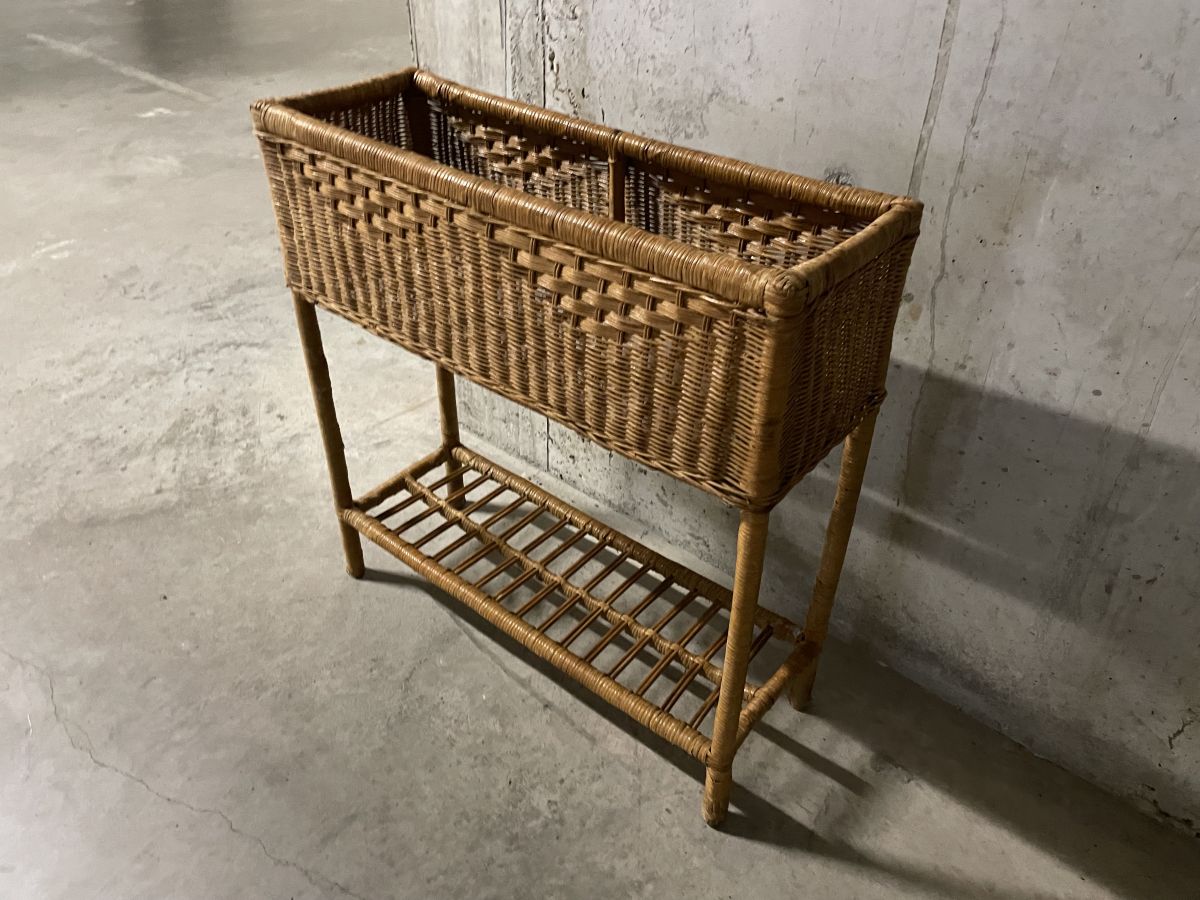 Jardinière en rotin des années 60, 1 bac et 1 étagère, traces d’usage (quelques manques de vernis), dimensions (cm) : L.65xH.69xP.23, bon état.