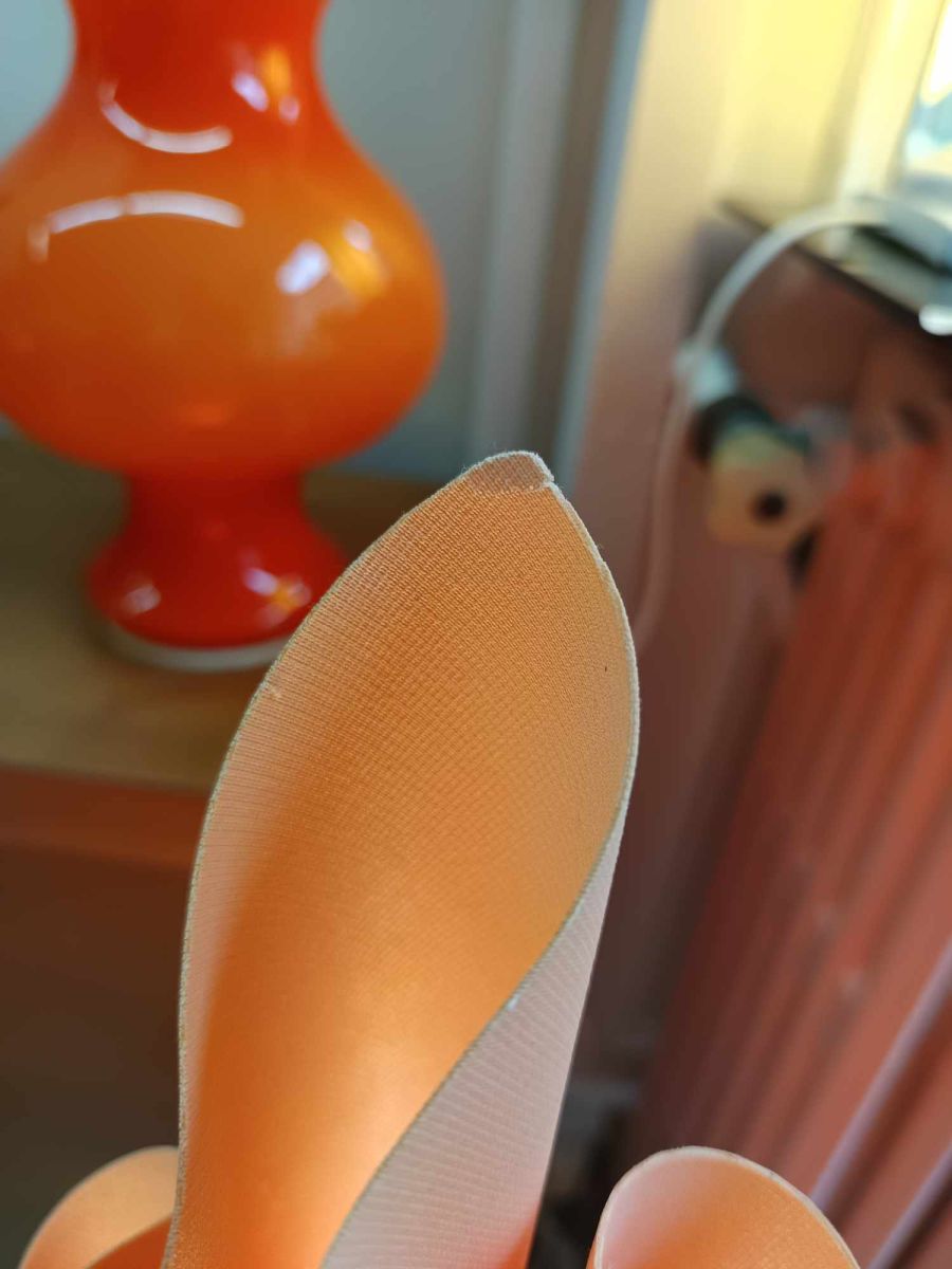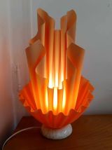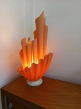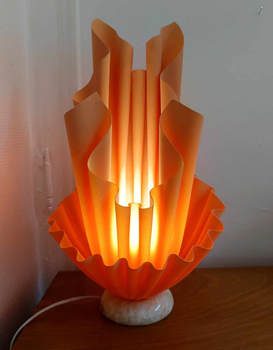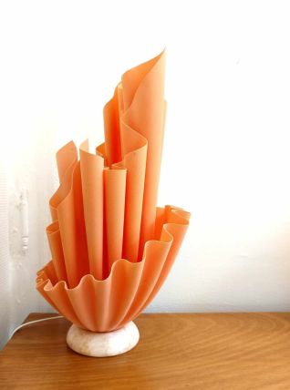 Lampe composée de deux jupes corolles en résine orange empilée formant une belle forme toute en volutes, reposant sur une base circulaire en pierre. Son "drapé" asymétrique donne un superbe effet de mouvement et en fait un luminaire unique, de caractère.