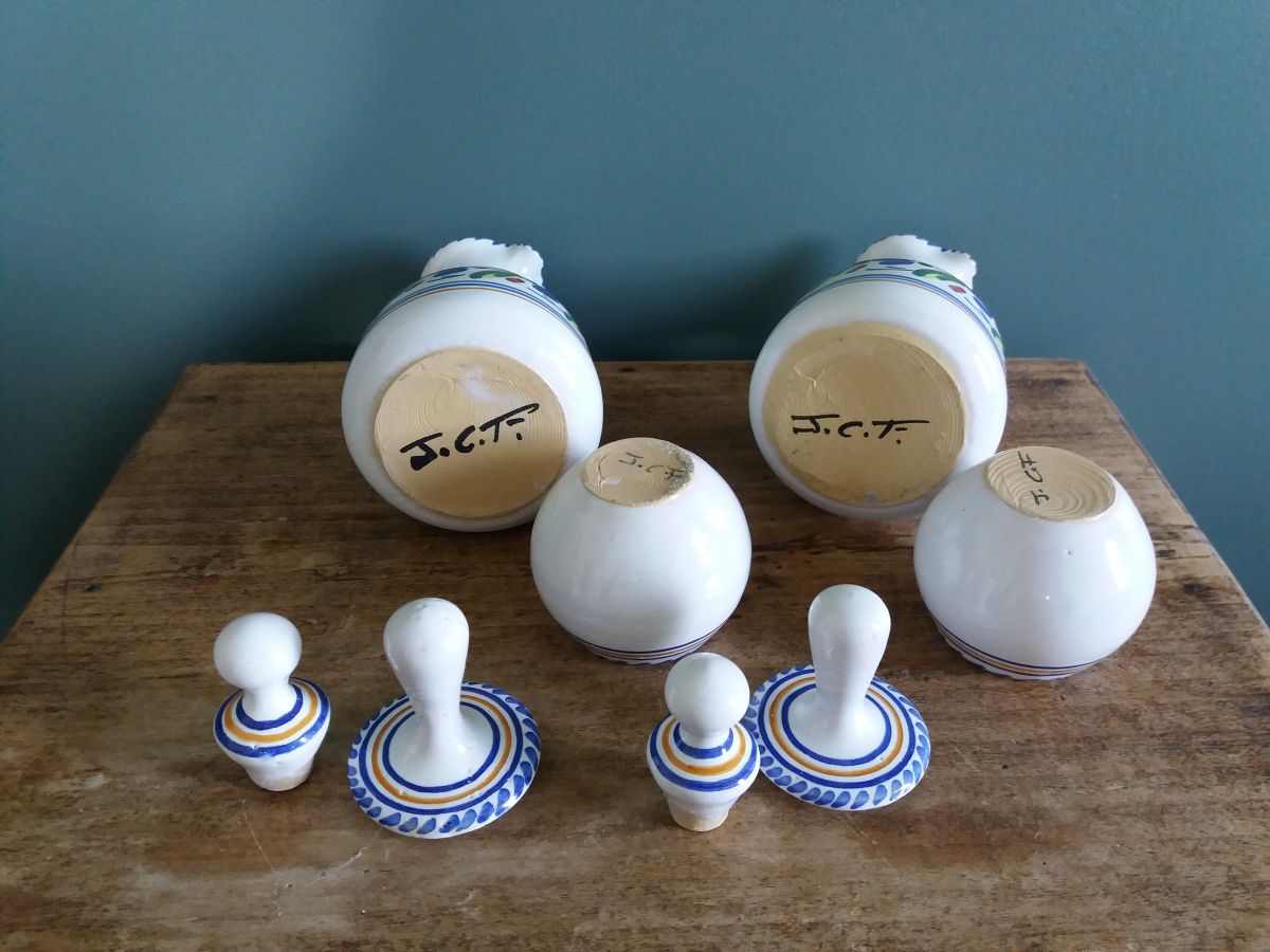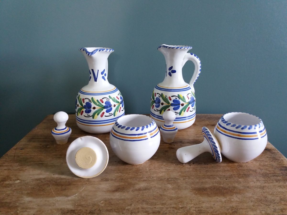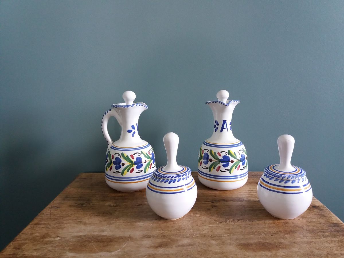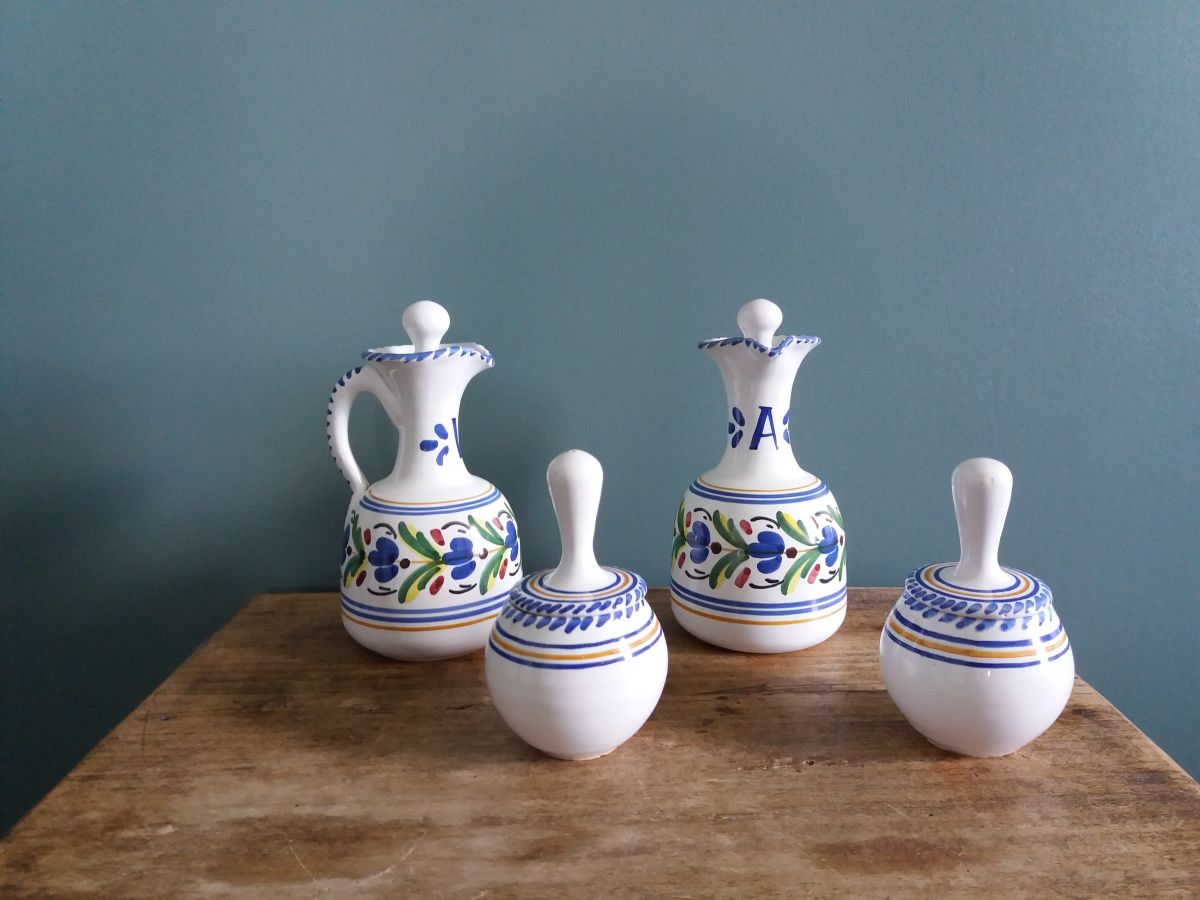 Bel ensemble comprenant deux pichets et deux coupelles rondes avec chacun son adorable petit bouchon muni d’une poignée en céramique. Le décor, joliment réalisé a été peint à la main. Ils sont signé JCF. L’un des pichet comporte la lettre a comme acieta, huile en espagnol. Cet ensemble proviendrait donc d’Espagne et selon certaines sources pour des objets avec la même signature, il s’agirait de céramique d’un atelier de El puente del arzobispo. Et peut-être une céramique dite Talavera car certains motifs (les points bleus qui cerclent les bords) apparaissent sur des céramiques estampillées Talavera. Cet ensemble date peut-être des années 80 ou 90 et a probablement été fabriqué pour un restaurant. L’ensemble est en très bon état, ni fêle, ni égrenure. Les pichets mesurent 13 cm de hauteur, 15 cm avec le bouchon, les petites coupelles mesurent 5 cm de hauteur et 9 cm de hauteur avec les bouchons.