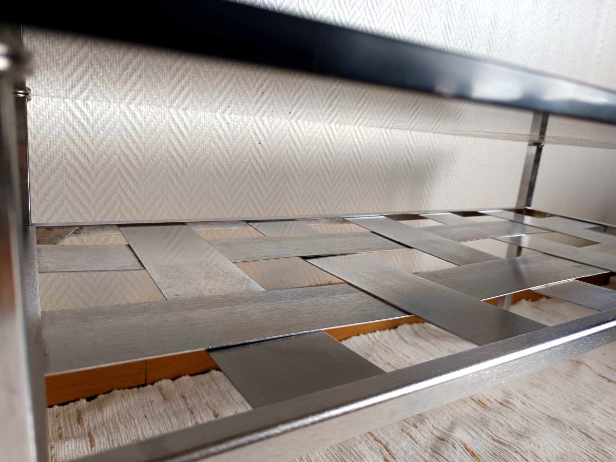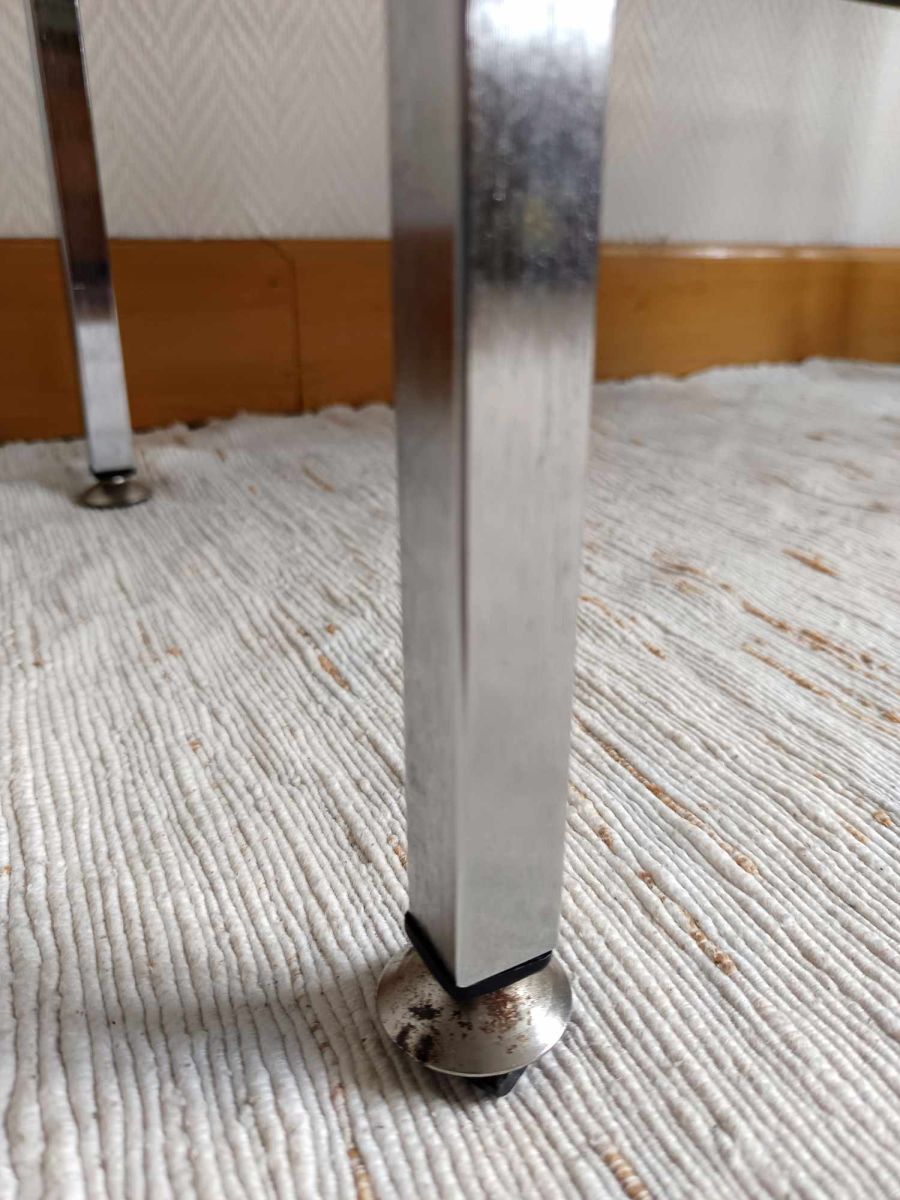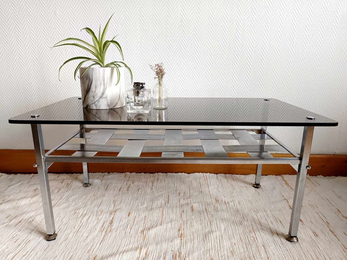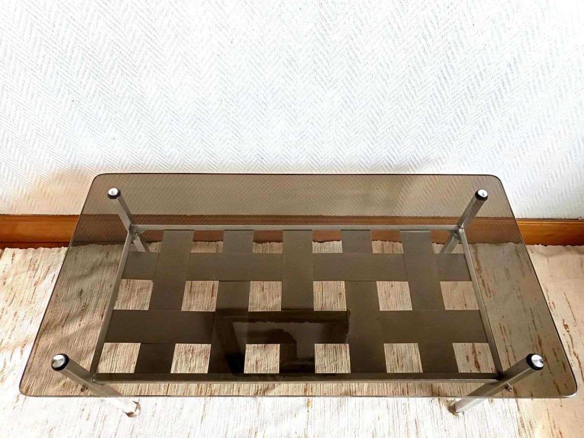 Structure composée d'une entretoise en lamelles d'aluminium brossé tressée (matrice "dessus, dessous"), reposant sur quatre pied de corps rectangulaire finitions pieds toupies. Plateau rectangulaire en verre épais fumé avec fixations rondes en métal également chromé.