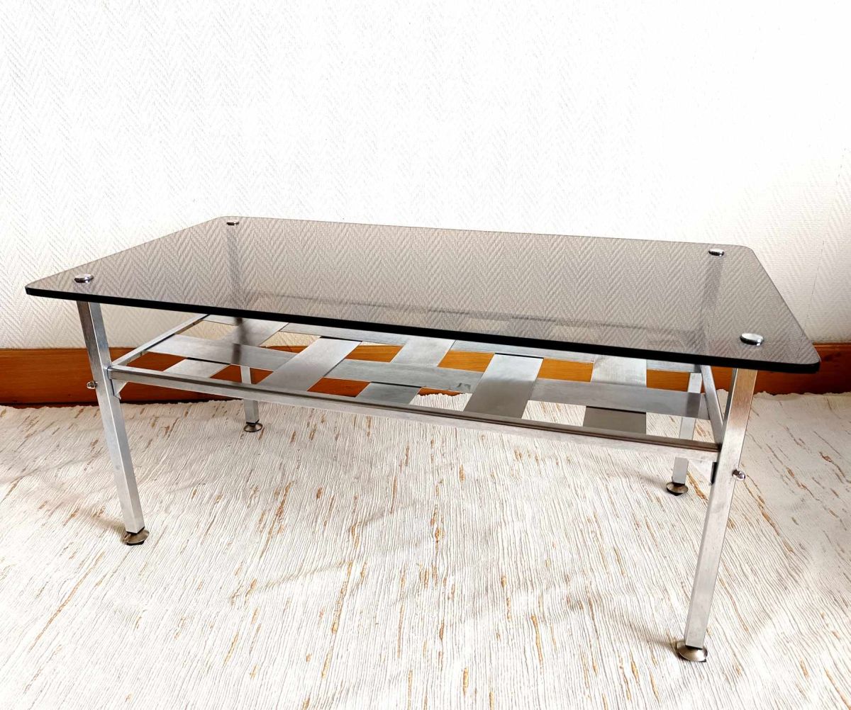 Table basse aluminium brossé et verre fumé 1970