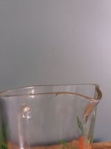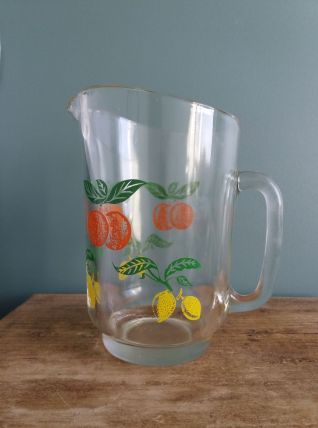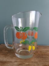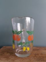 Ce joli pichet en verre décoré de motifs citrons et oranges mettra une touche de fraicheur et de gaîté sur votre table au moment de servir une citronnade sur la terrasse. Il date probablement des années 70 ou 80 mais sa forme épurée lui donne un air très moderne et facilite grandement son nettoyage. Il est en bon état général, pas de fêle, pas d’effacement des motifs et peu de rayures mais présente un petit défaut, d’origine il me semble ou peut-être marque d’un coup, sur le bord haut. Il mesure 18 cm de hauteur, 17 cm de l’anse au bec, et 12 cm pour l’autre largeur.