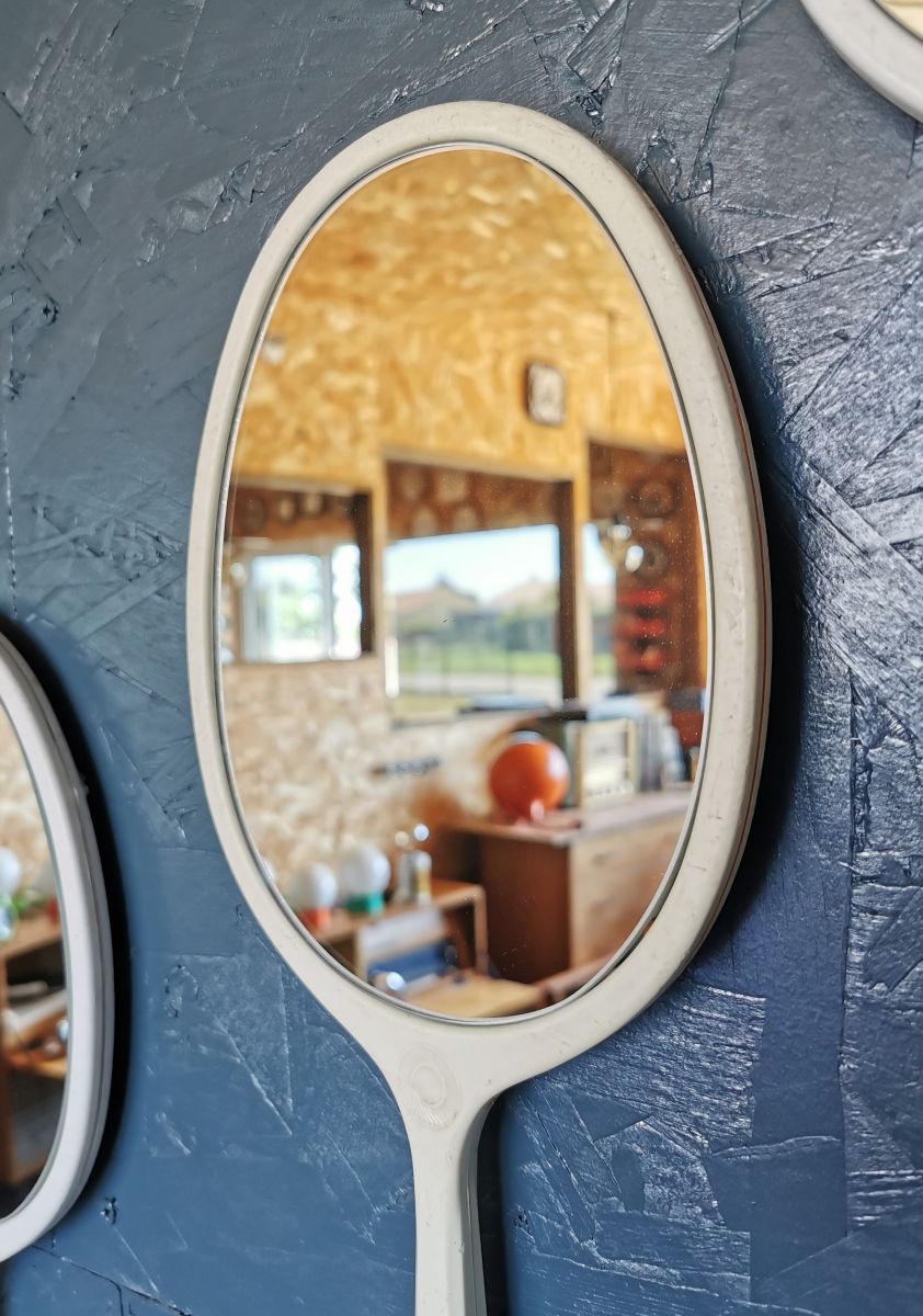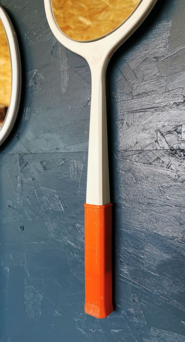 Ici, voici la raquette miroir aux manche orange si représentatif des années 70.