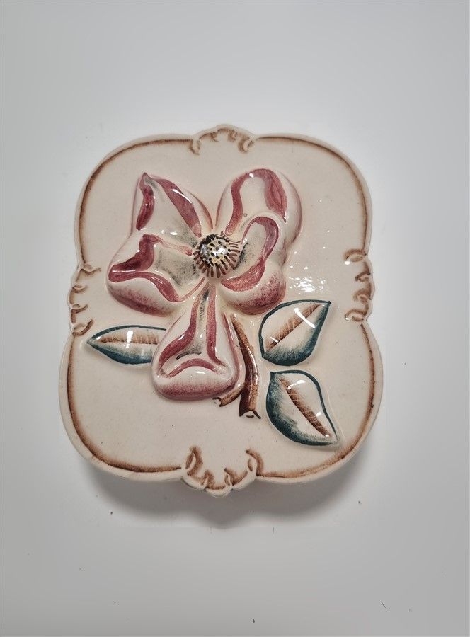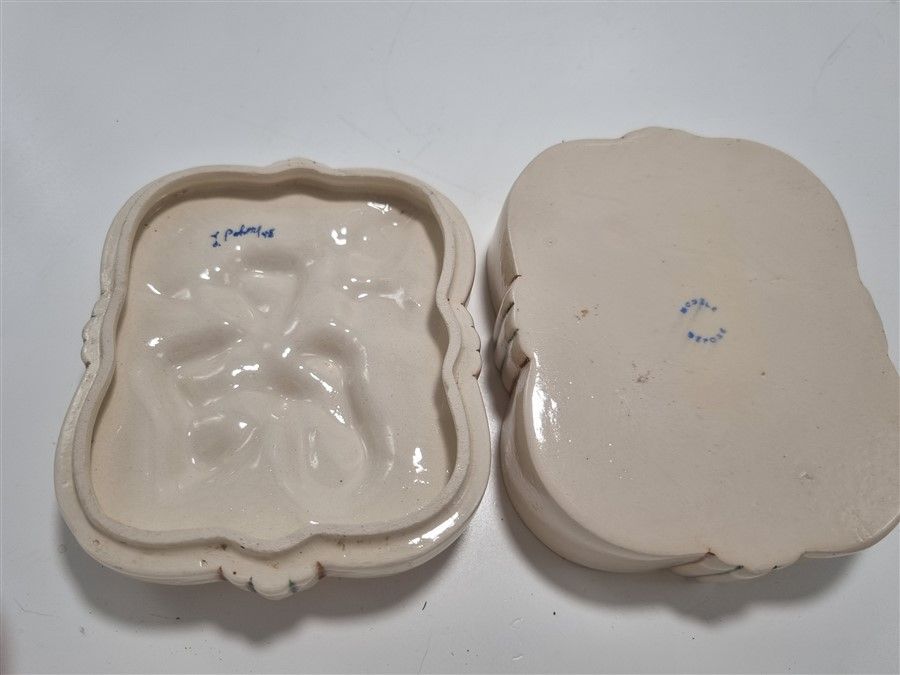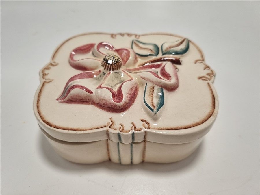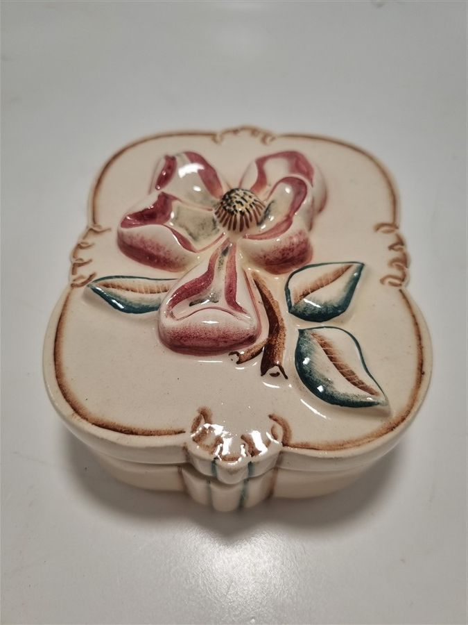Boîte vintage en céramique, son couvercle est décoré d'une fleur rose en relief dans un esprit barbotine.