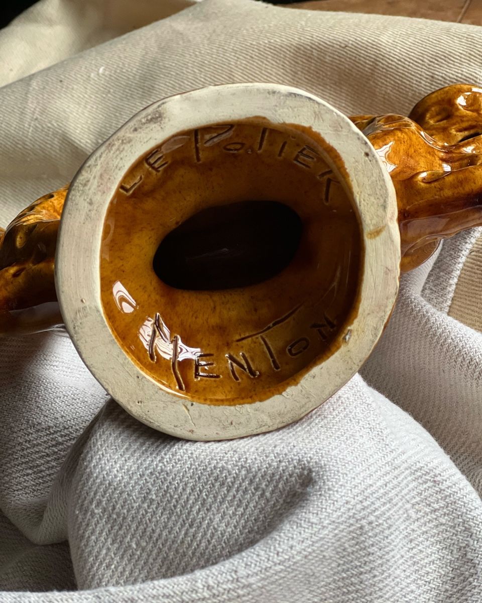 Il est en parfait état, avec une belle brillance et une glaçure reflétant la lumière sur son émail. Il présente une finition lisse et des détails propres à son créateur, le potier de Menton.