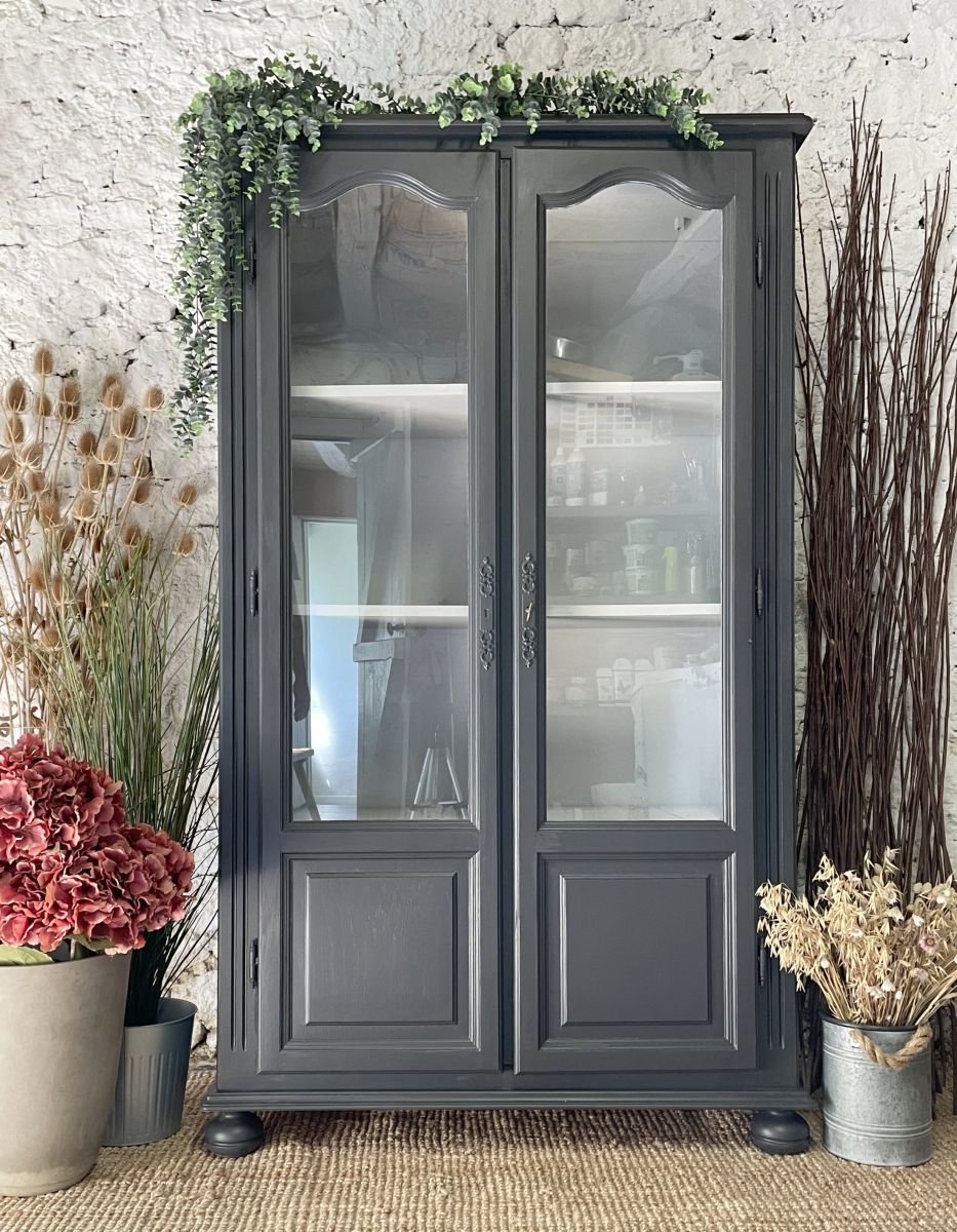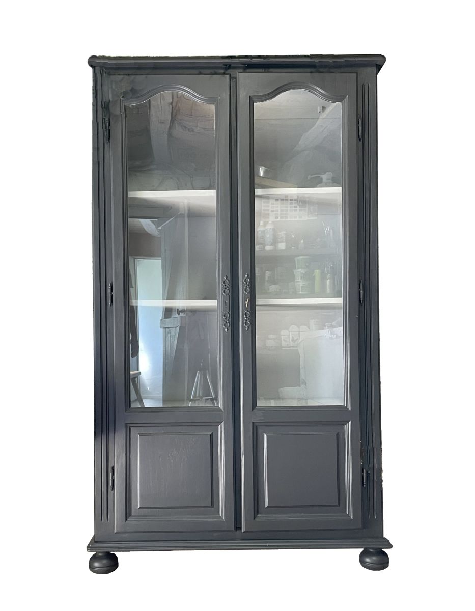 Une bibliothèque vitrée de taille moyenne, rafraîchie avec de la peinture à la craie graphite et scellée avec un vernis mat.