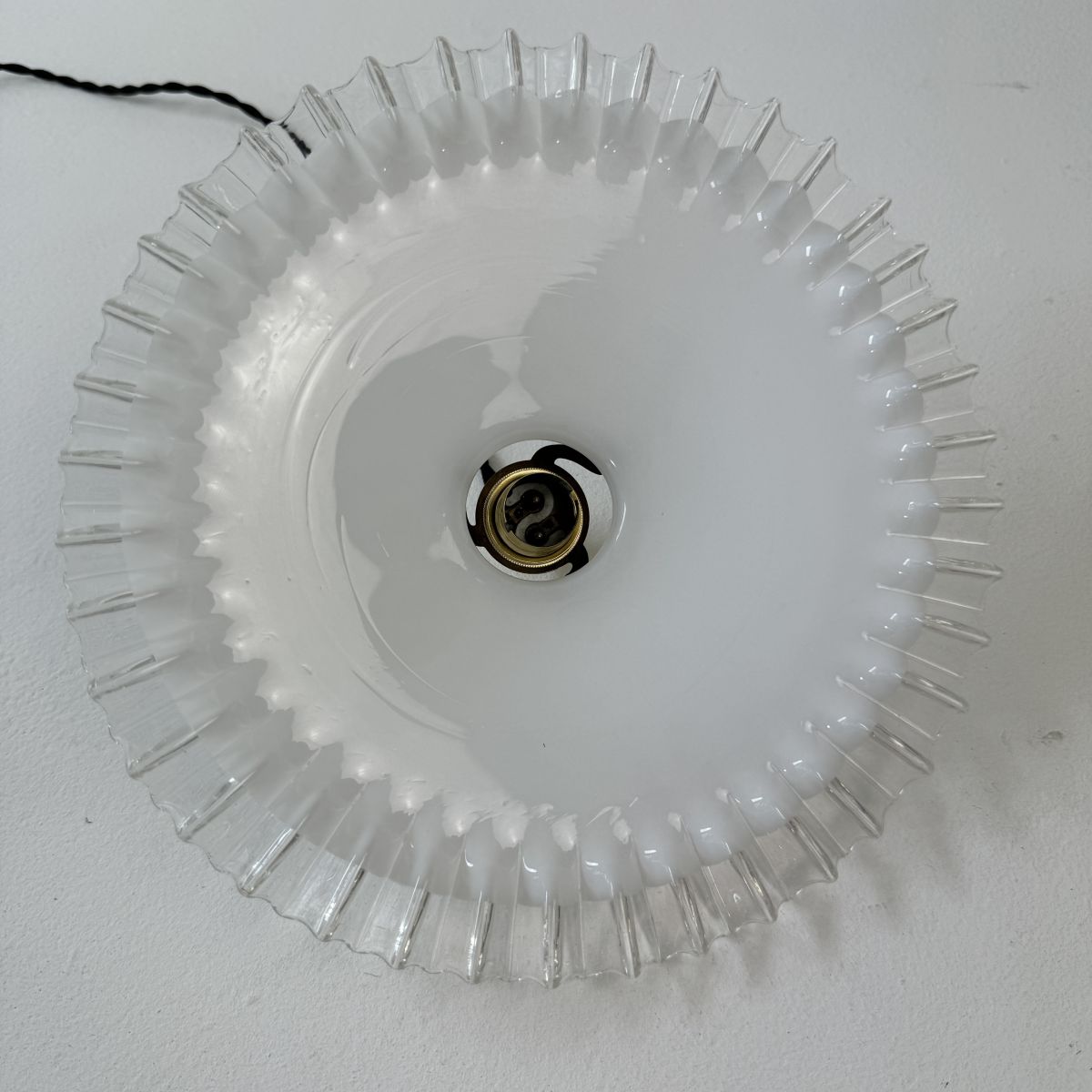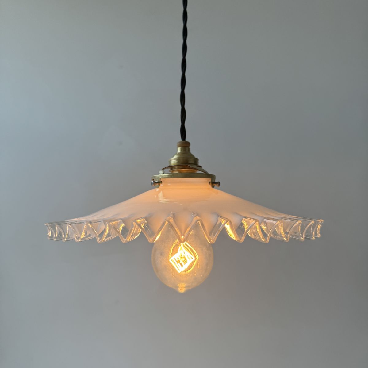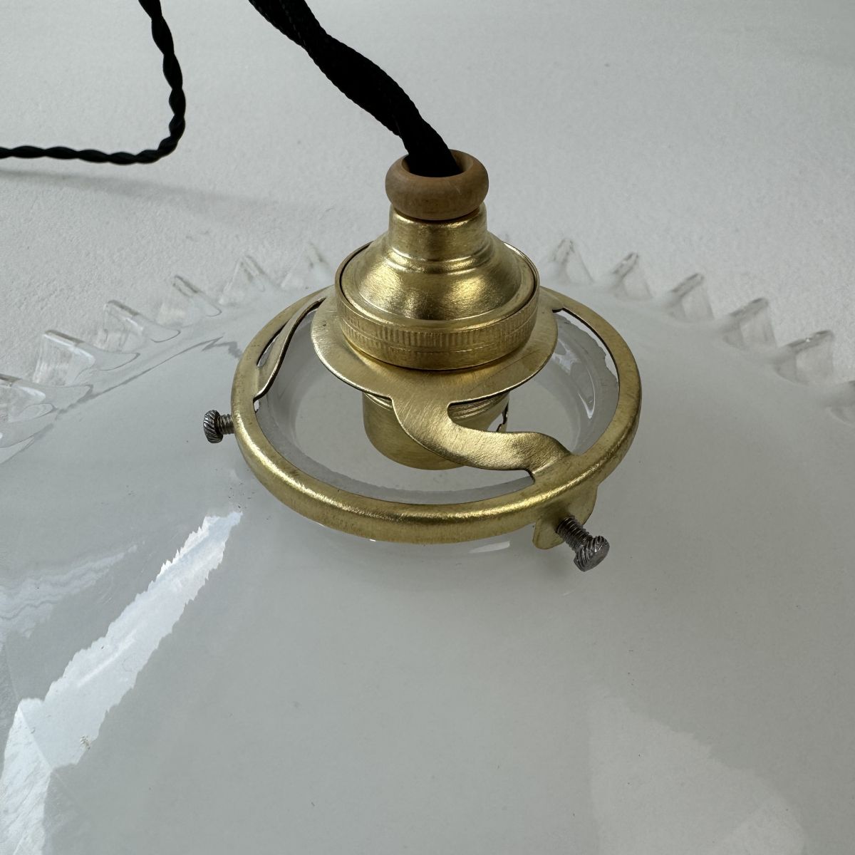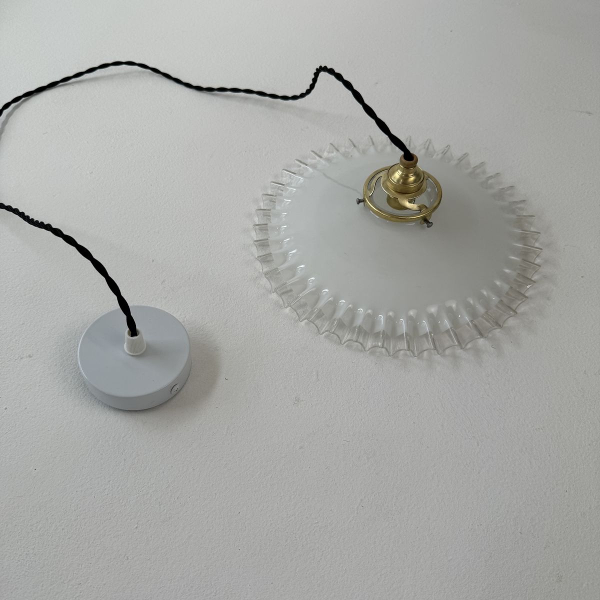 Ancienne suspension vintage en opaline dentelée. Belle lumière. Quelques traces du temps.