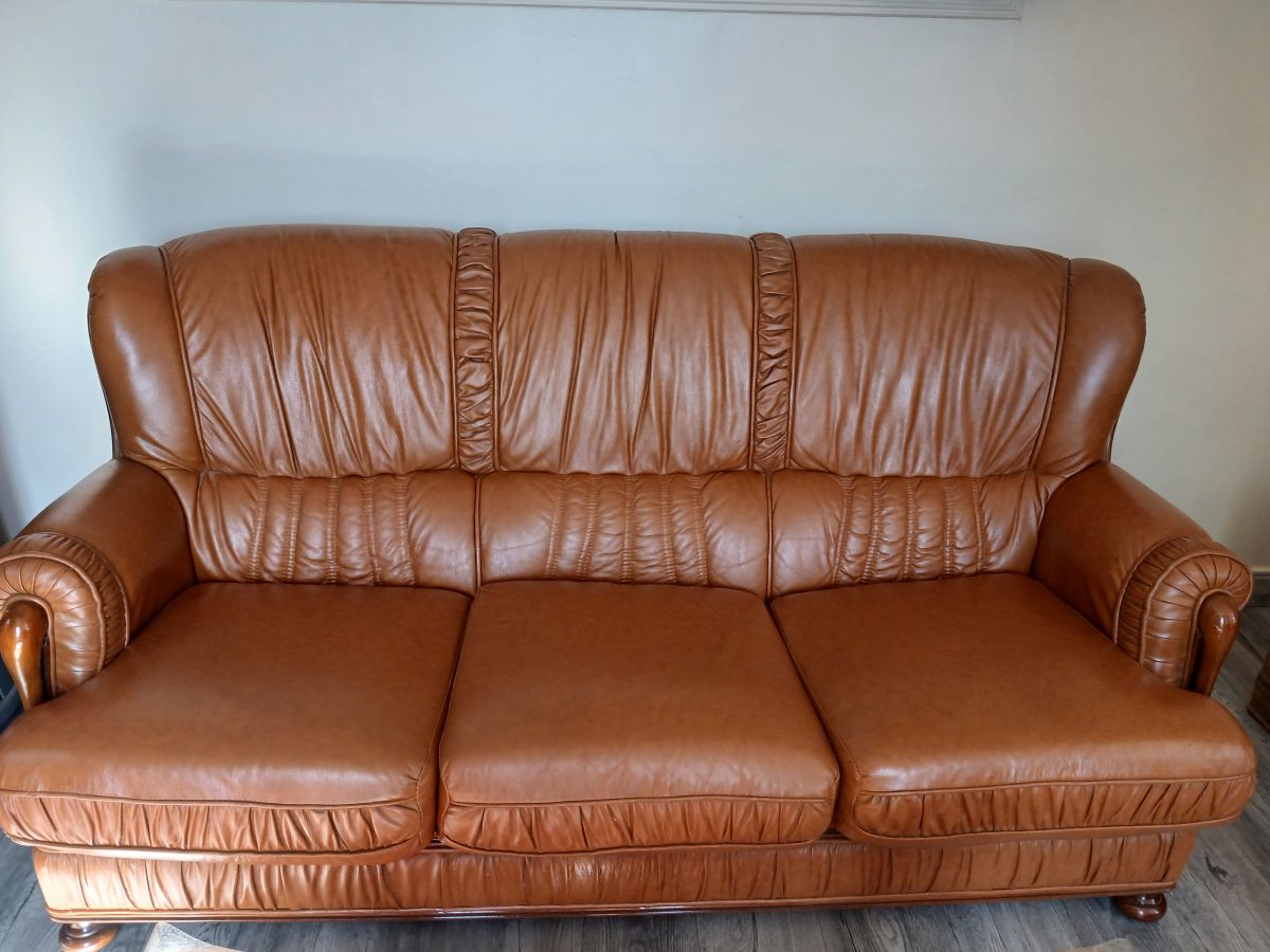 Canapé droit et unfauteuil assorti en cuir marron. Ont toujours été protégés par une housse. Très bon état.