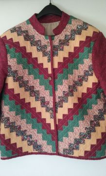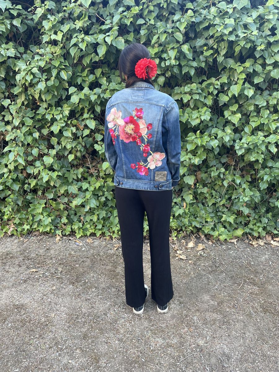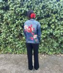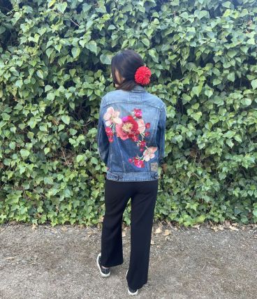 Veste en jean, avec fleurs brodées dans le dos, dominance rouge/rose.