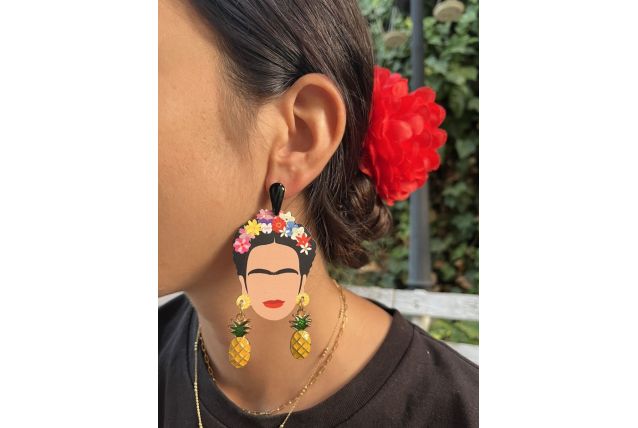Boucles d'oreille avec Frida Kahlo, elle-même portant des boucles d'oreille en forme d'ananas.