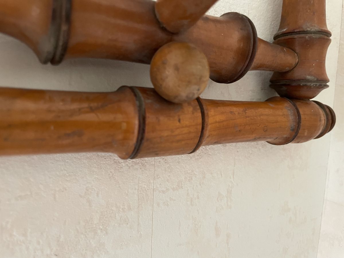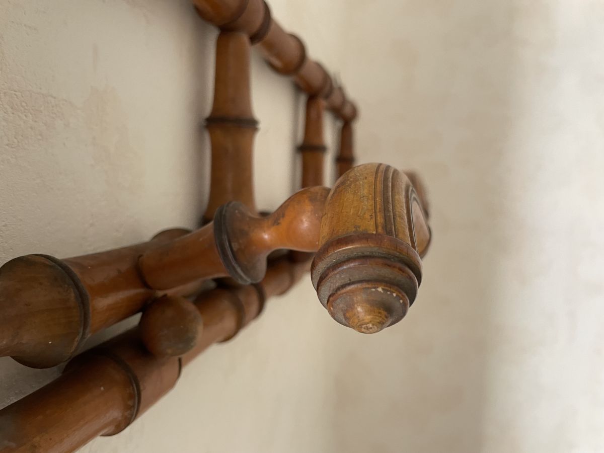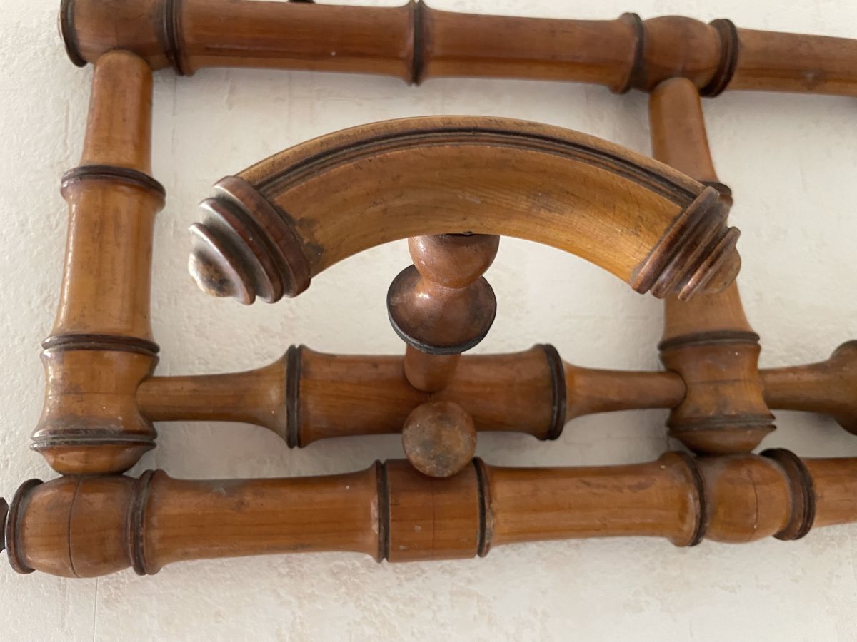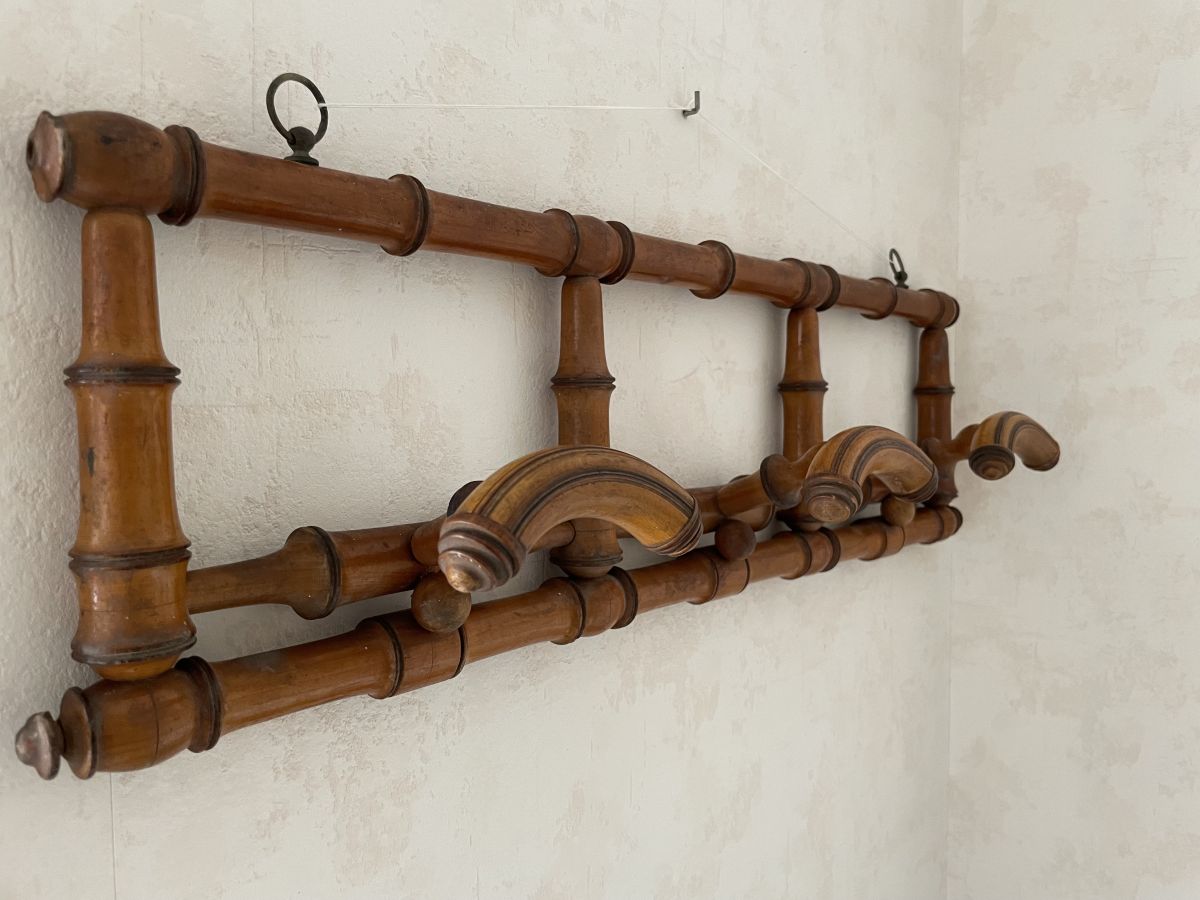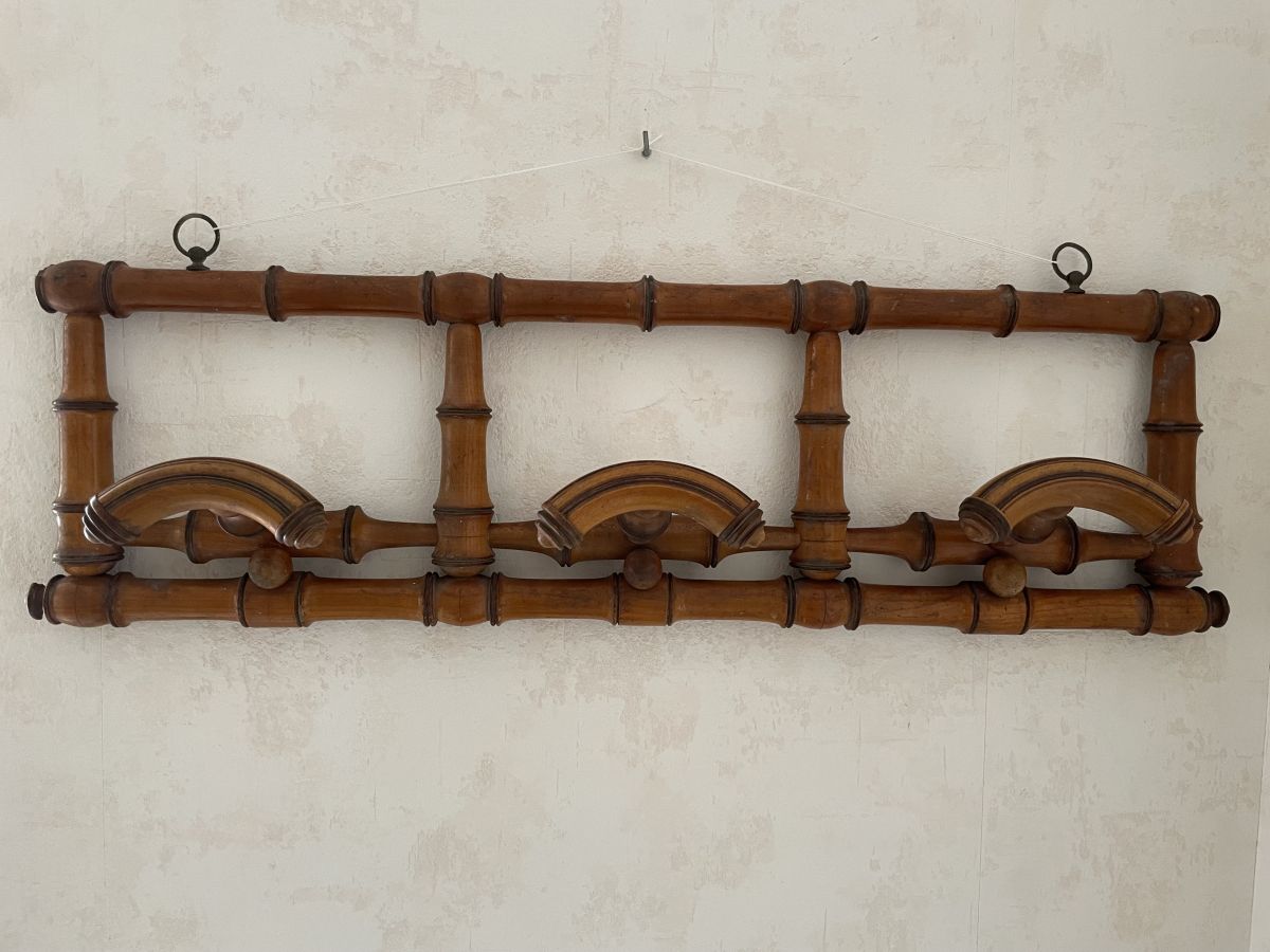 Portemanteau en bois imitation bambou des années 60, 3 patères, très belle patine, traces d’usage et un petit manque (voir photos), dimensions (cm) : L.70xH.20xP.13, bon état.