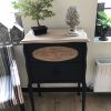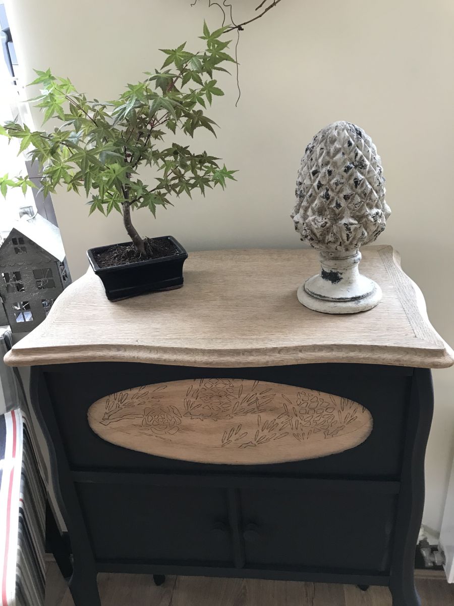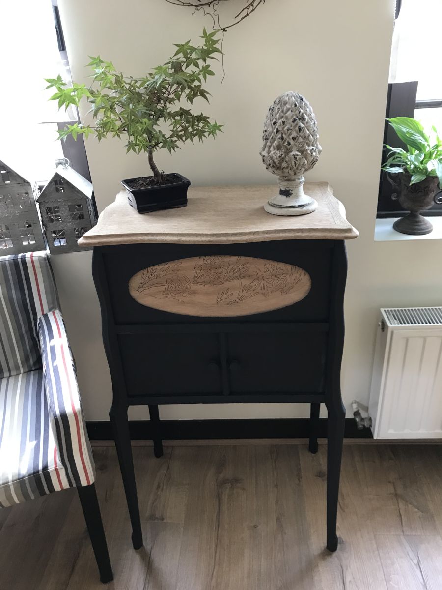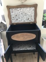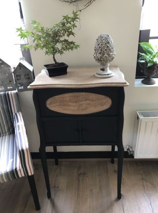 Petit meuble original totalement relooké avec soin dans un noir mat pour le bas du meuble.