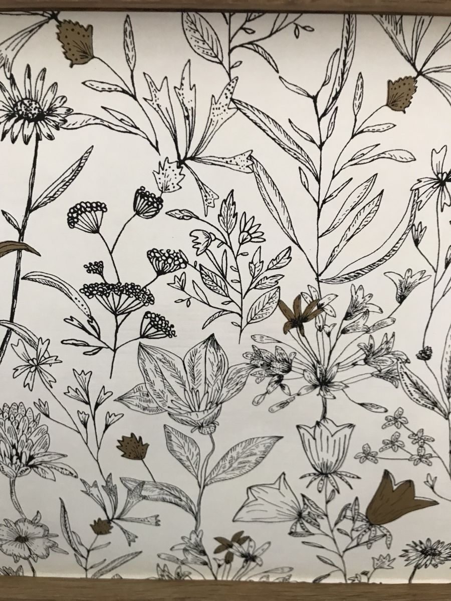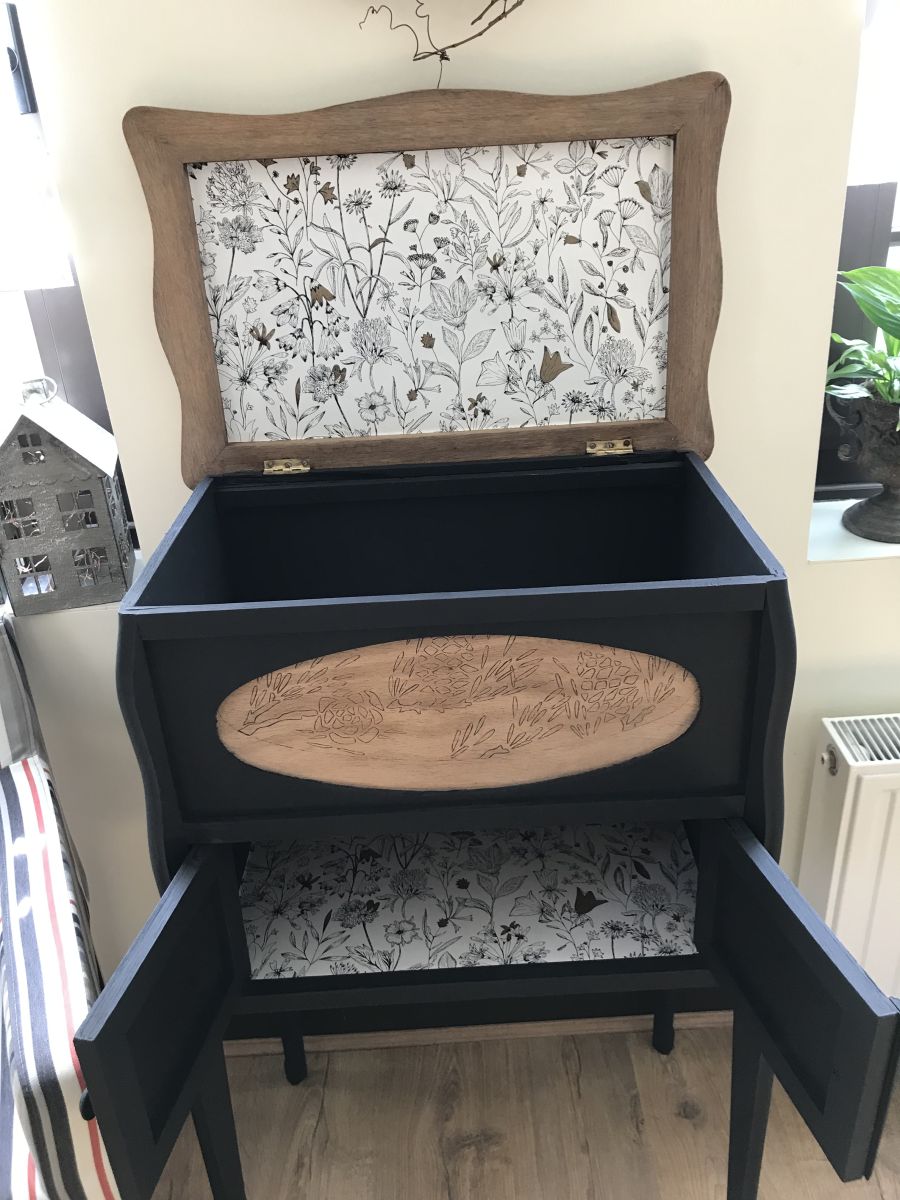 J'ai fait le choix de laisser le plateau amovible en bois naturel et j'ai recouvert l'intérieur du meuble d'un papier peint qui s'accorde parfaitement avec le noir des pieds et le naturel du plateau.