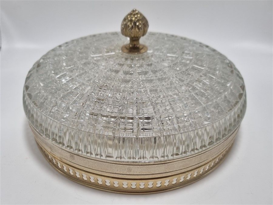 Plafonnier Lucien Gau, la galerie est en laiton ajouré et le globe en verre épais, au motif en relief offrant une belle luminosité.