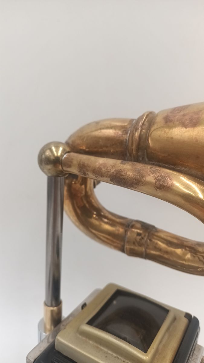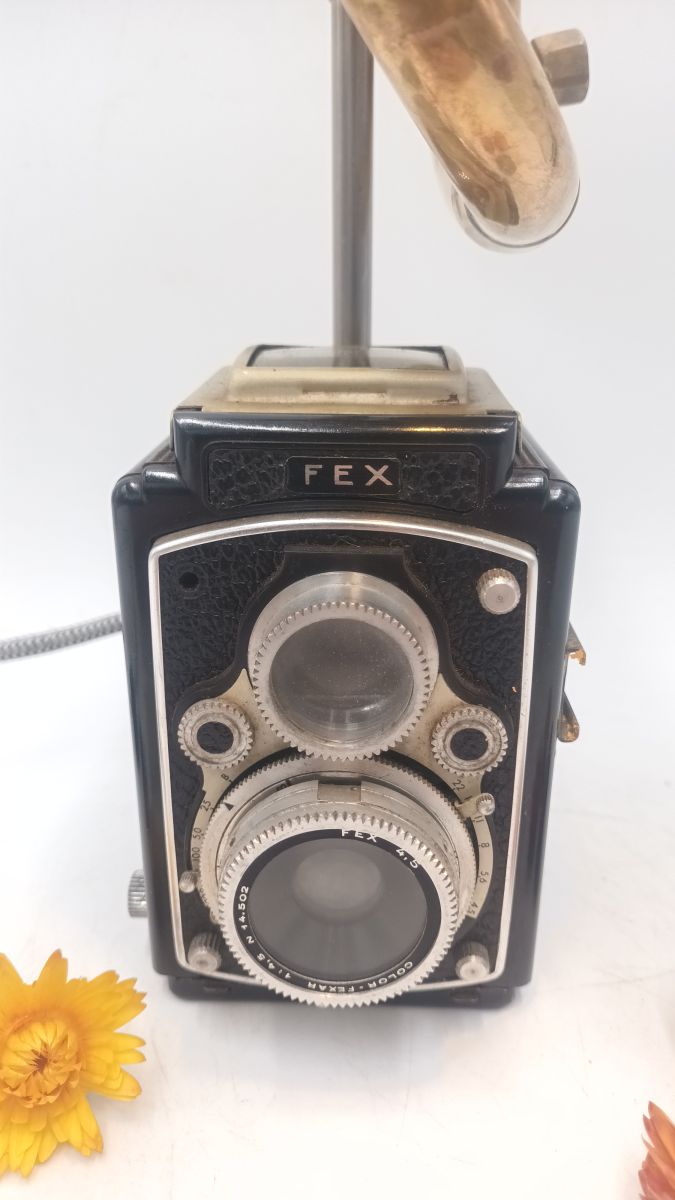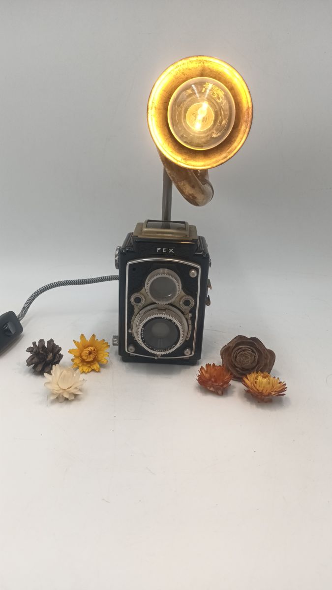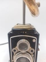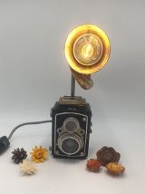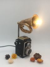 Ancien petit appareil photo à double objectifs, associé à un klaxon poulet poulet.