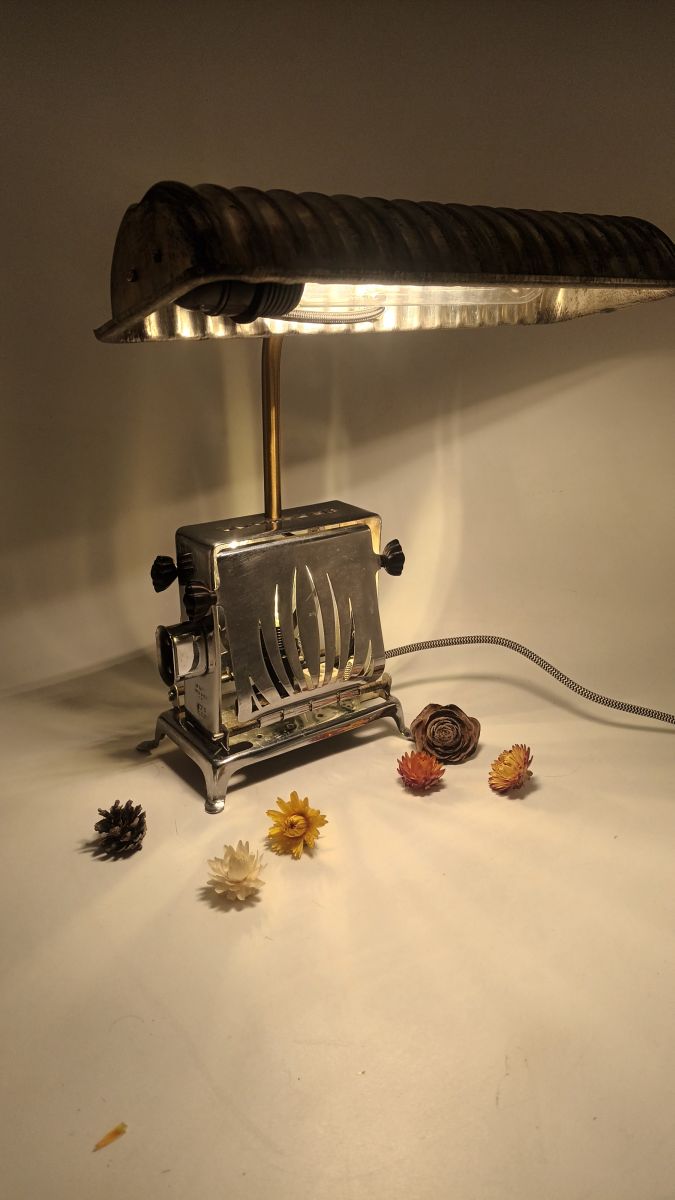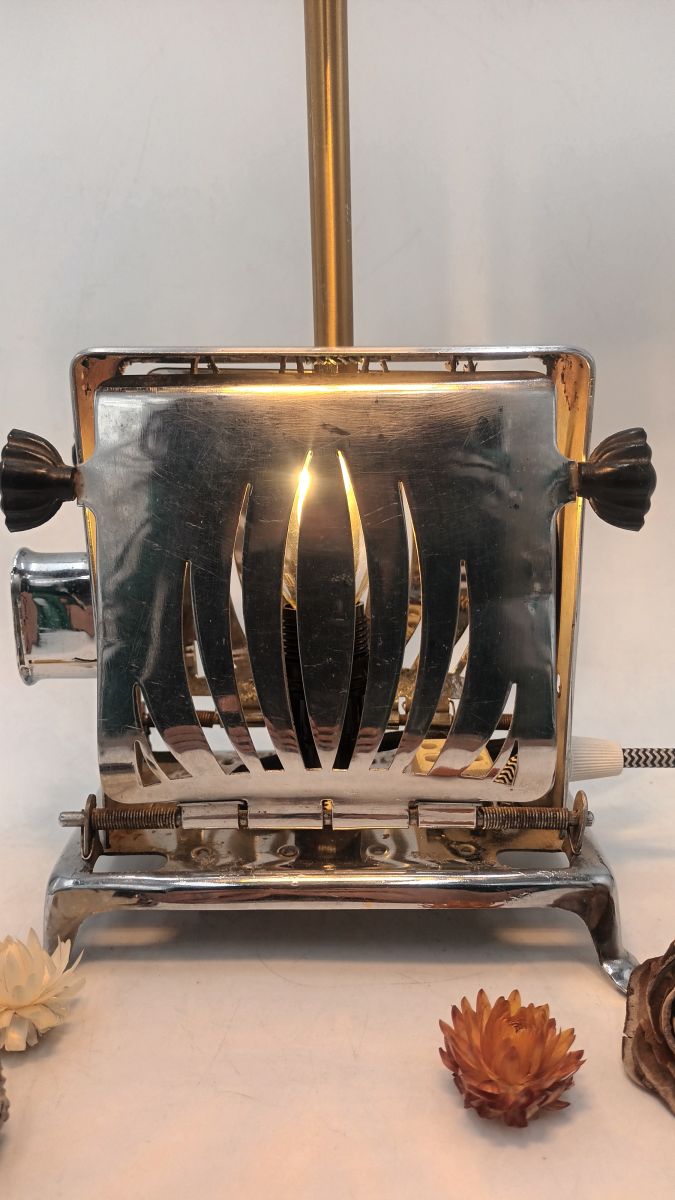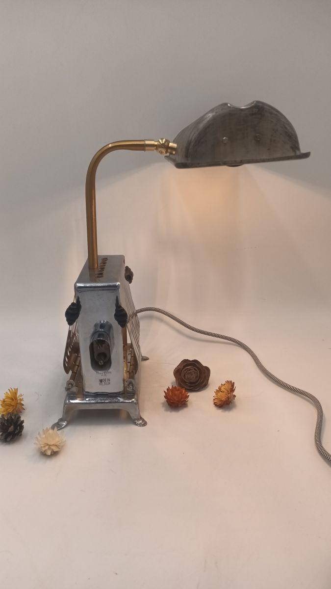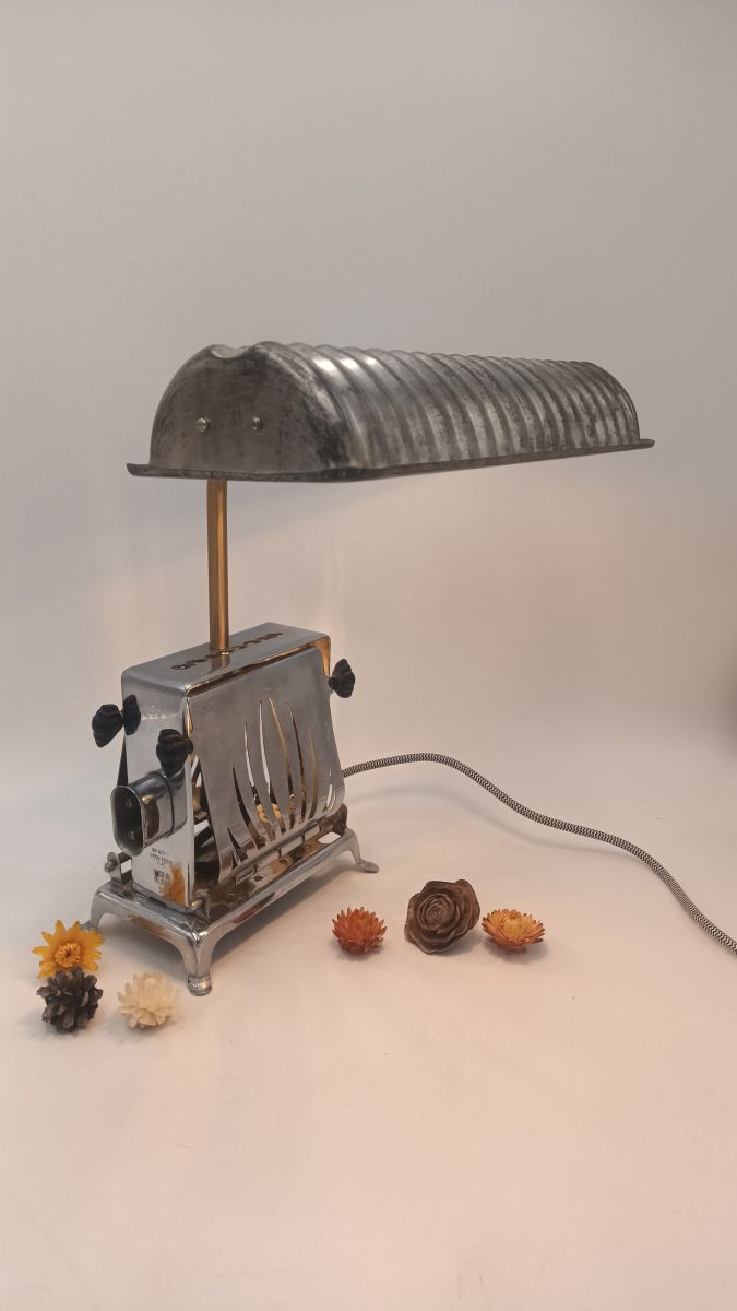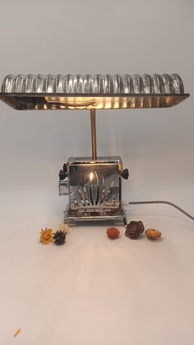Ancien grille-pain des années 30 associé à un moule à gâteau et transformé en lampe.