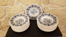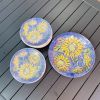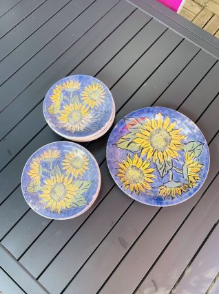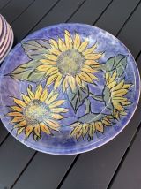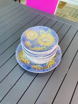 Lot de 12 assiettes à dessert céramique italienne modele tournesol , style Van Gogh en parfait etat faisant 19,5cm de diametre et un plat pour par exemple présenter le gâteau , de 29cm de diametre Ceraminter , made in Italy années 80-90 envoi soigné