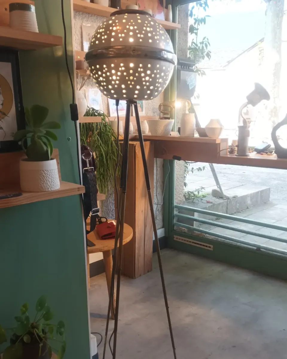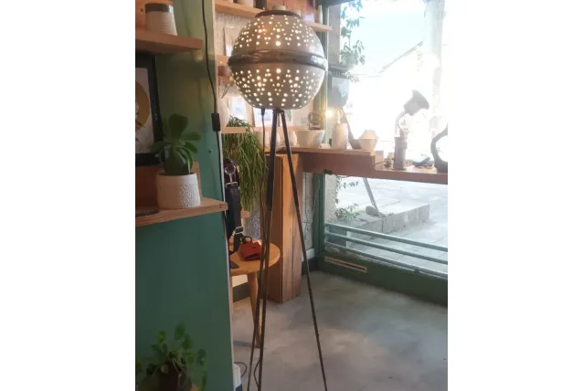 Lampadaire fait à partir d'une ancienne machine à laver manuelle des années 60 et un ancien trepied d'appareil photo en laiton.