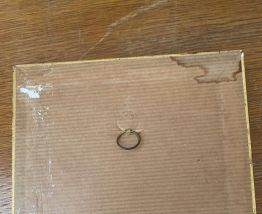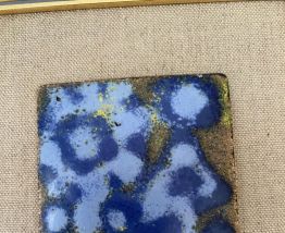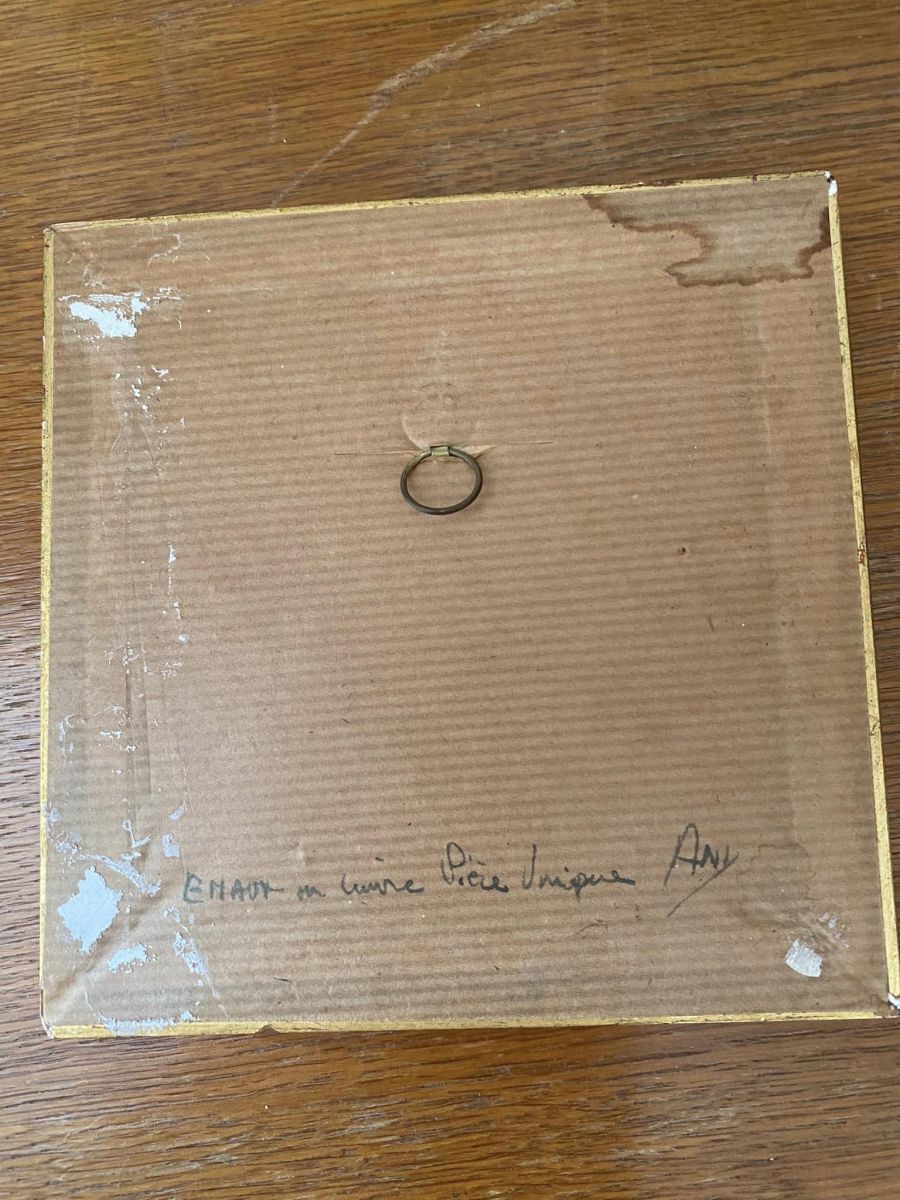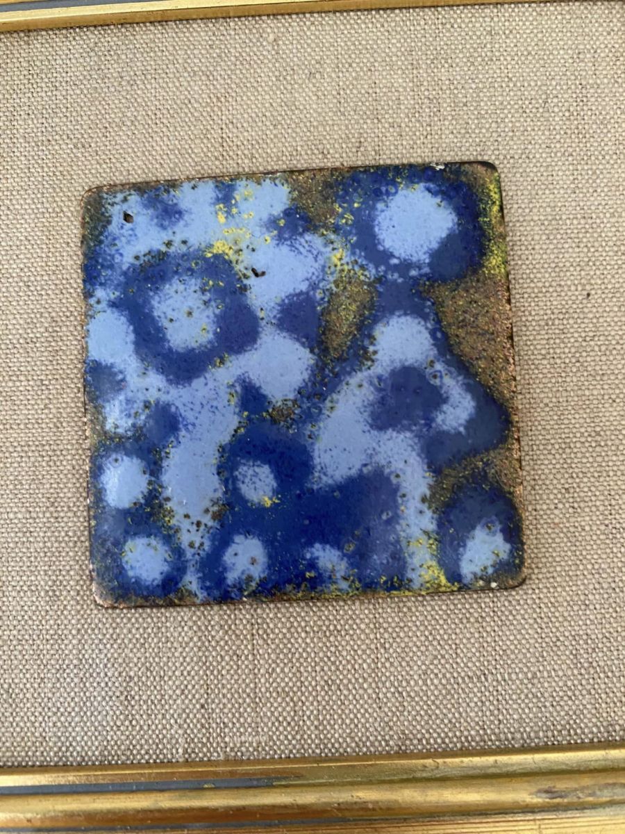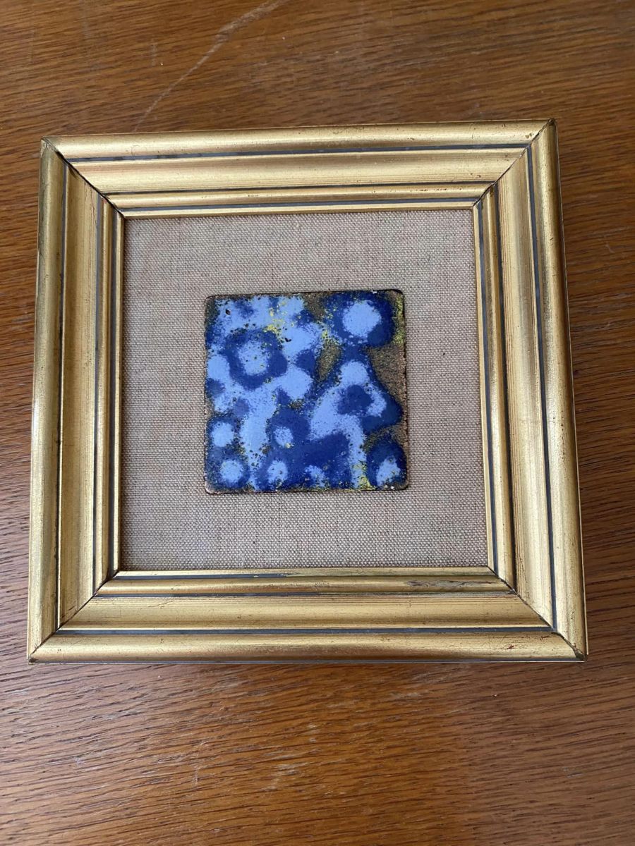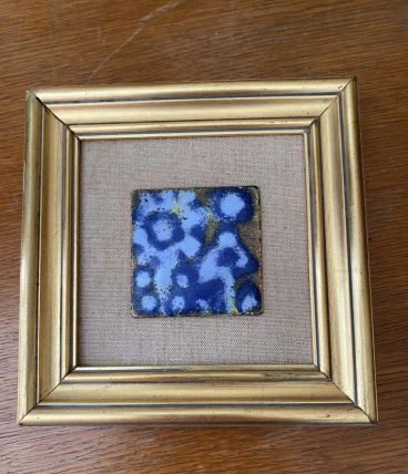 Émaux sur cuivre encadré. Motif abstrait. Fond en tissu toile de lin. Cadre en bois doré. Inscription au dos : pièce unique et signature (inconnue).