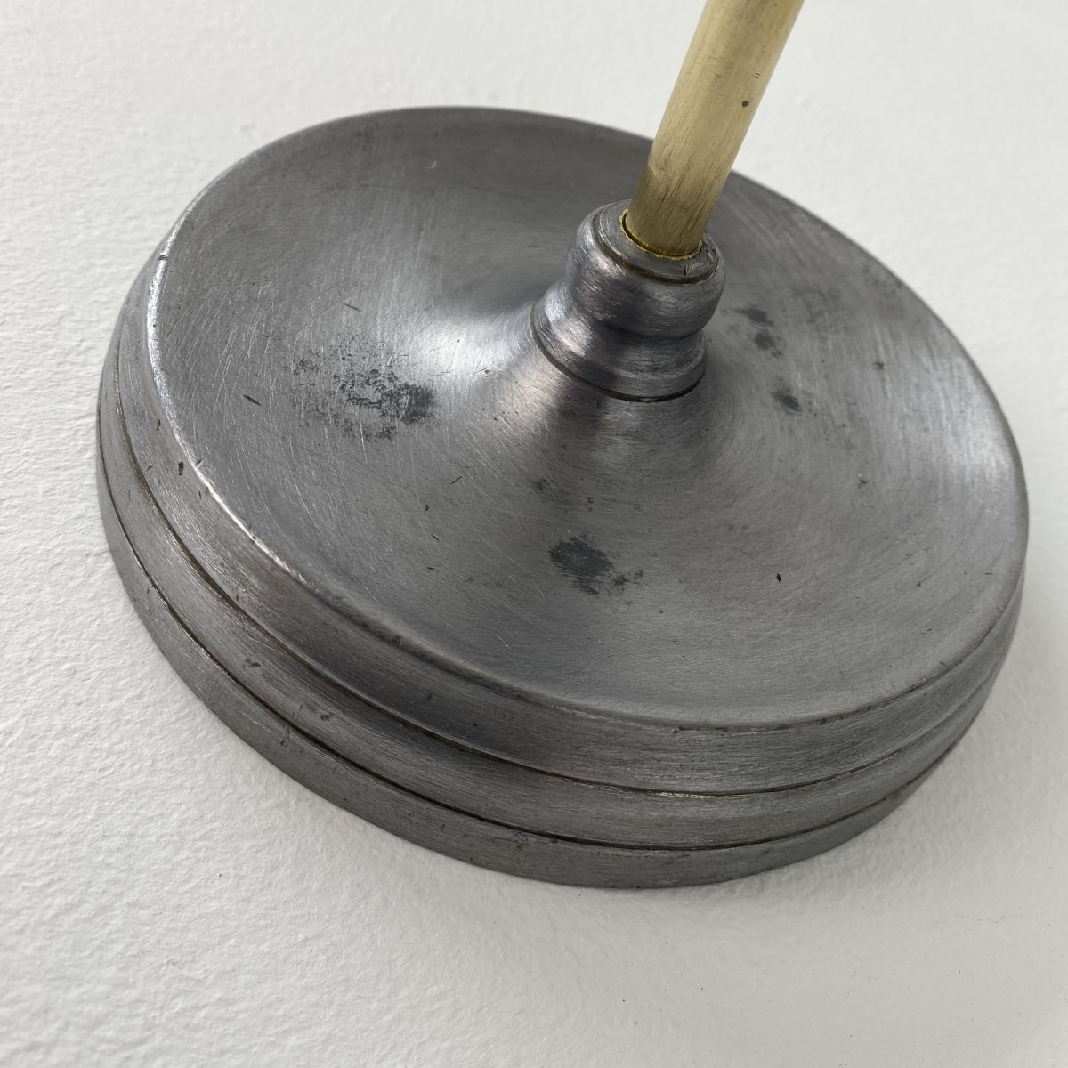 Très bel état général pour cette lampe qui a été démontée, poncée et nettoyée. L’axe central et le bras sont en laiton. Electricité refaite à neuf avec fil noir en tissu tressé. Interrupteur sur douille à baïonnette en Bakélite (ampoule B22).
