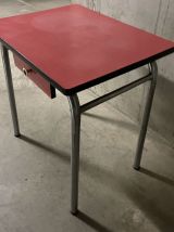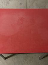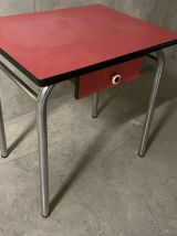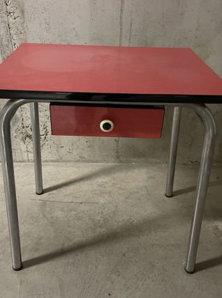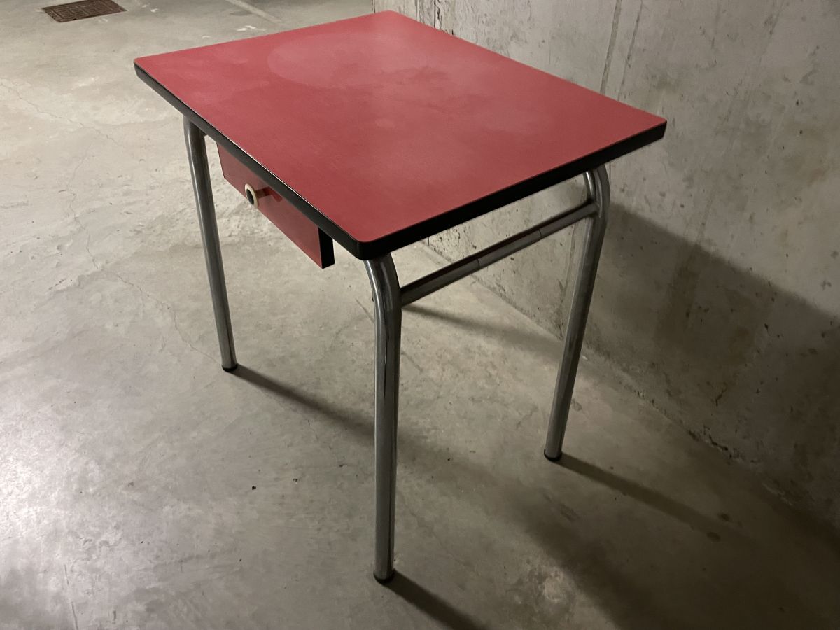 Table/bureau en formica rouge framboise des années 60, piétement en métal chromé, 1 tiroir, traces sur le plateau (voir photos), dimensions (cm) : L.70xH.74xP.55.