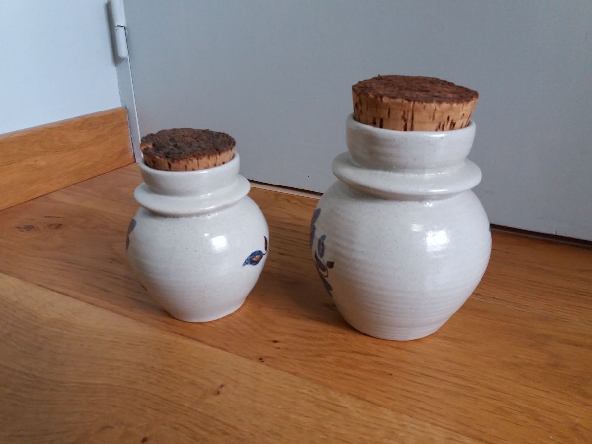 Deux jolis pots en céramique tournée émaillée avec un décor de feuilles de couleur chocolat et bleu sur fond gris beige. Ils sont estampillés dessous « faïence de Saint Amand, France » et le nom de cette collection est « sologne ». Ils datent des années 60 ou fin 50, la dernière manufacture à Saint Amand ayant été fermée en 1962. Peut-être des pots à moutarde, à olives, ou pourquoi pas pour y mettre le gros sel, le liège régulant le taux d’humidité Ils sont, en effet, munis de leur bouchon en liège d’origine (le plus petit présente une découpe pour une cuillère). Les pots sont en parfait état, ni fêle, ni égrenure. Les bouchons en liège, encore entiers, présentent néanmoins la patine du temps et de l’usage sur leur face externe. Le grand pot mesure 15 cm de hauteur (bouchon non compris), 12 cm environ de diamètre, le plus petit pot mesure 12 cm de hauteur (sans le bouchon) et 10 cm environ de diamètre.