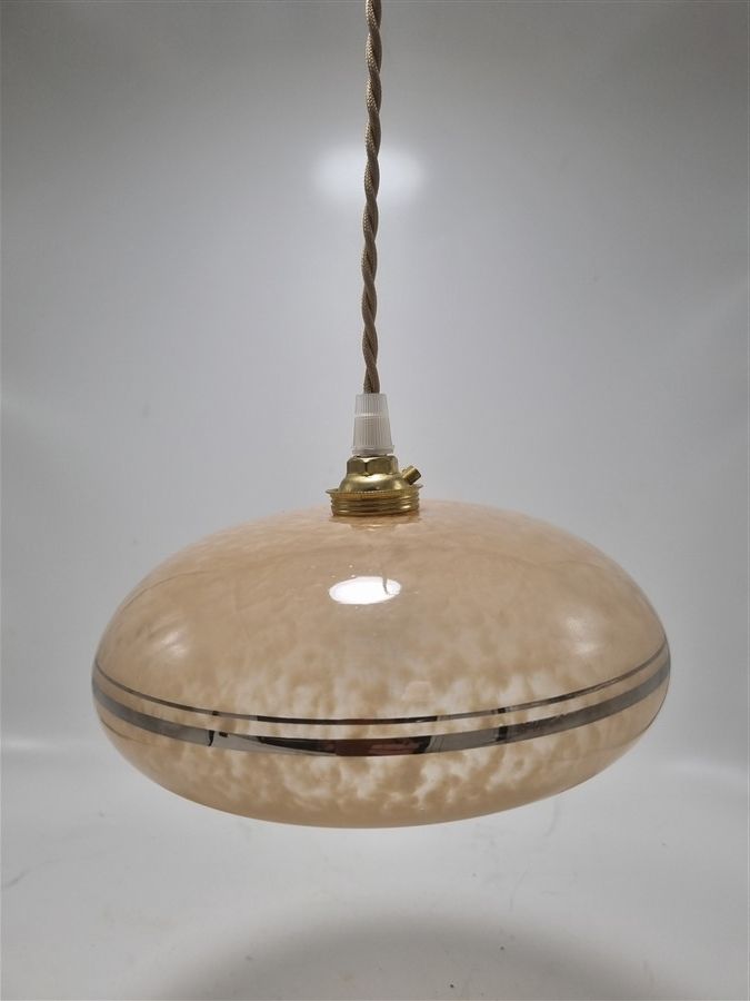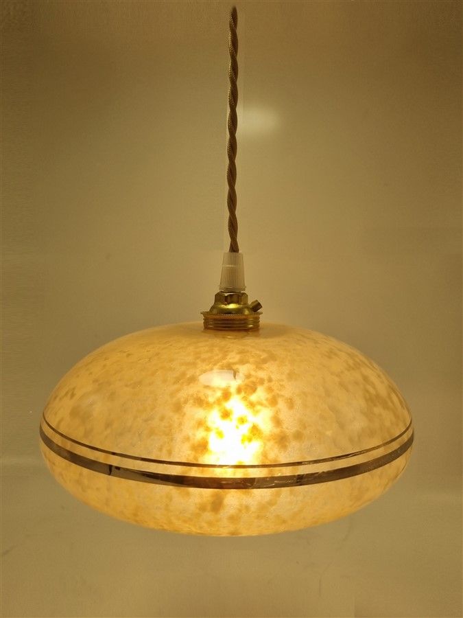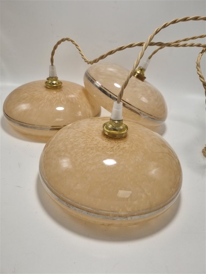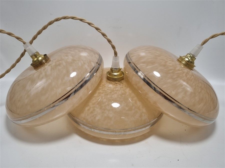 Trio de suspensions art déco rose moucheté aux contours relevés de deux liserés de couleur argentée.