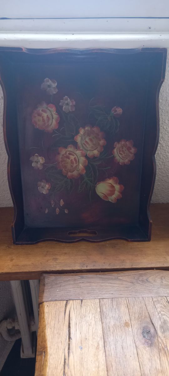 Grand plateau en bois couleur acajou décor de fleurs peintes ton de rose