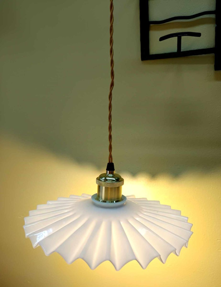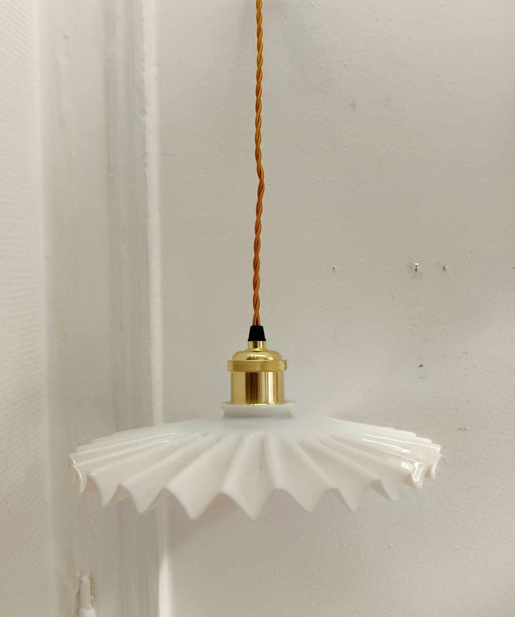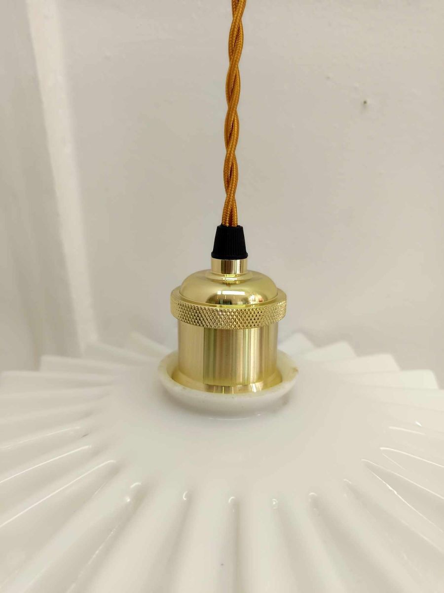 Suspension vintage composée d'une opaline gaufrée blanche montée à l'électricité.