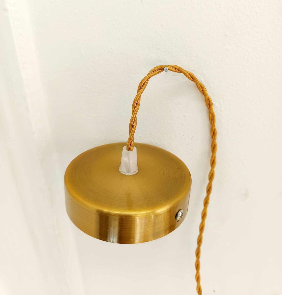 Douille dorée neuve, fil électrique en tissu torsadé doré neuf, pavillon rond doré neuf également. Donne une belle lumière.