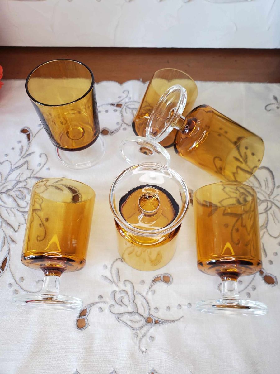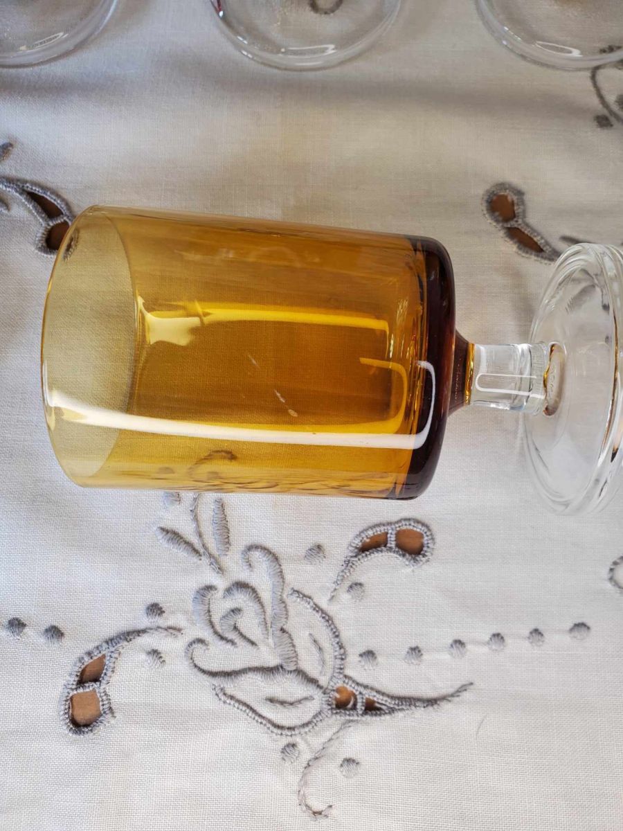 Les verres comportent un bol en teinte ambrée sur une tige en verre transparent.