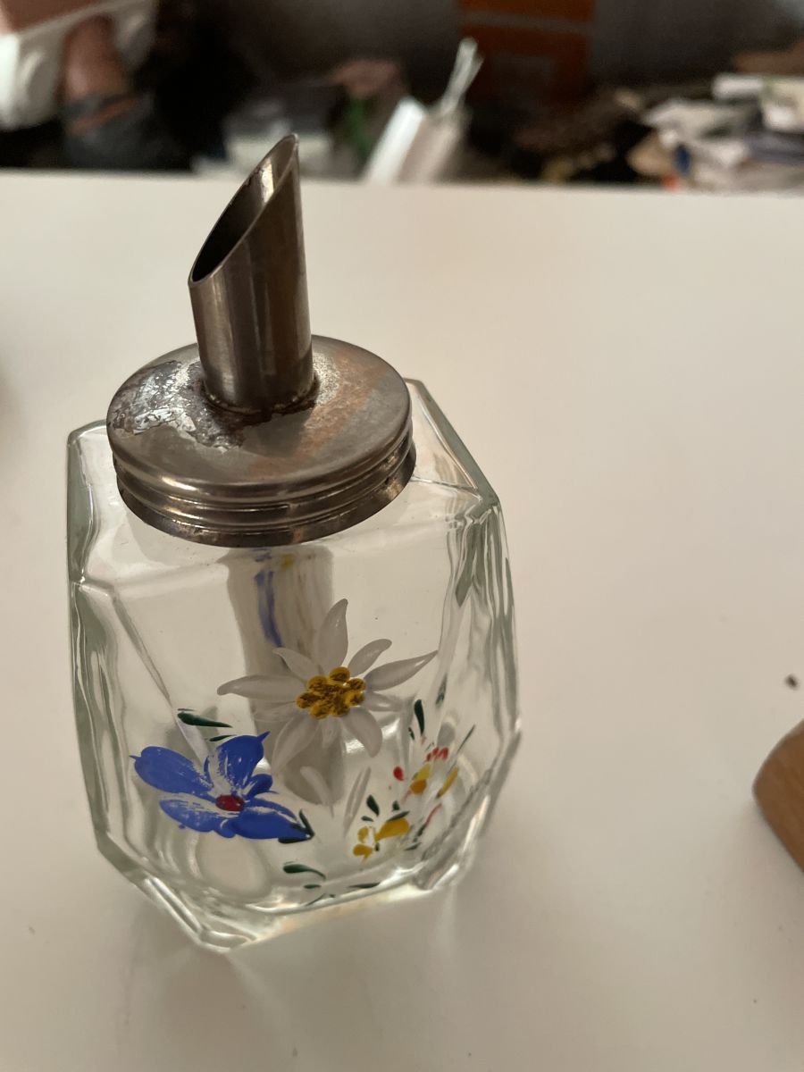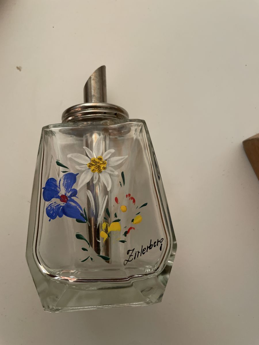 Sucrier en verre, décor edelweiss peint à la main, signature ou marque « Zirlerberg ».