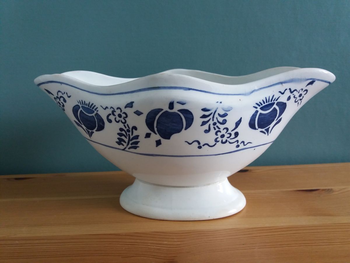 Charmante saucière en céramique décorée d’un motif floral réalisé au pochoir. D’après l’estampille dessous, elle daterait d’entre 1896 et 1952, le décor fait penser au style Art Déco, elle date donc peut-être des années 1910 -1930. Elle est en bon état général, pas de fêle ou d’éclat mais comporte quelques signes qui témoignent de son âge et font tout son charme: de très légères égrenures sur l’émaillage au niveau du rebord, de petites taches, et le motif semble effacé ou un peu flou sur un côté (d’origine probablement). Elle mesure 20 cm de longueur, 10 cm de largeur, 9,5 cm de hauteur.