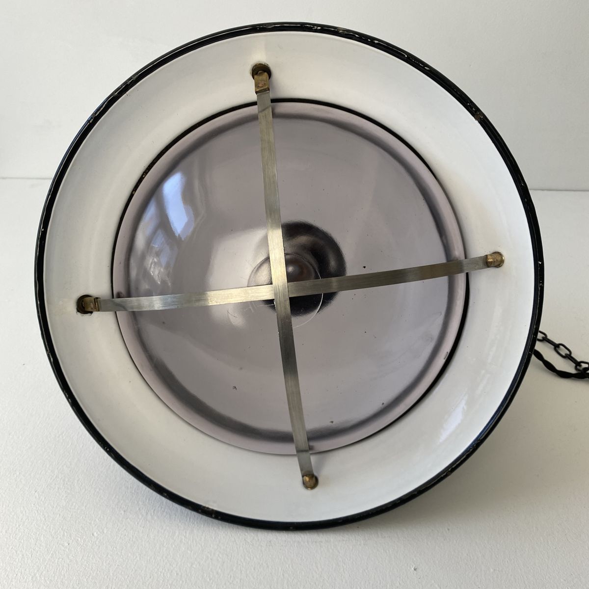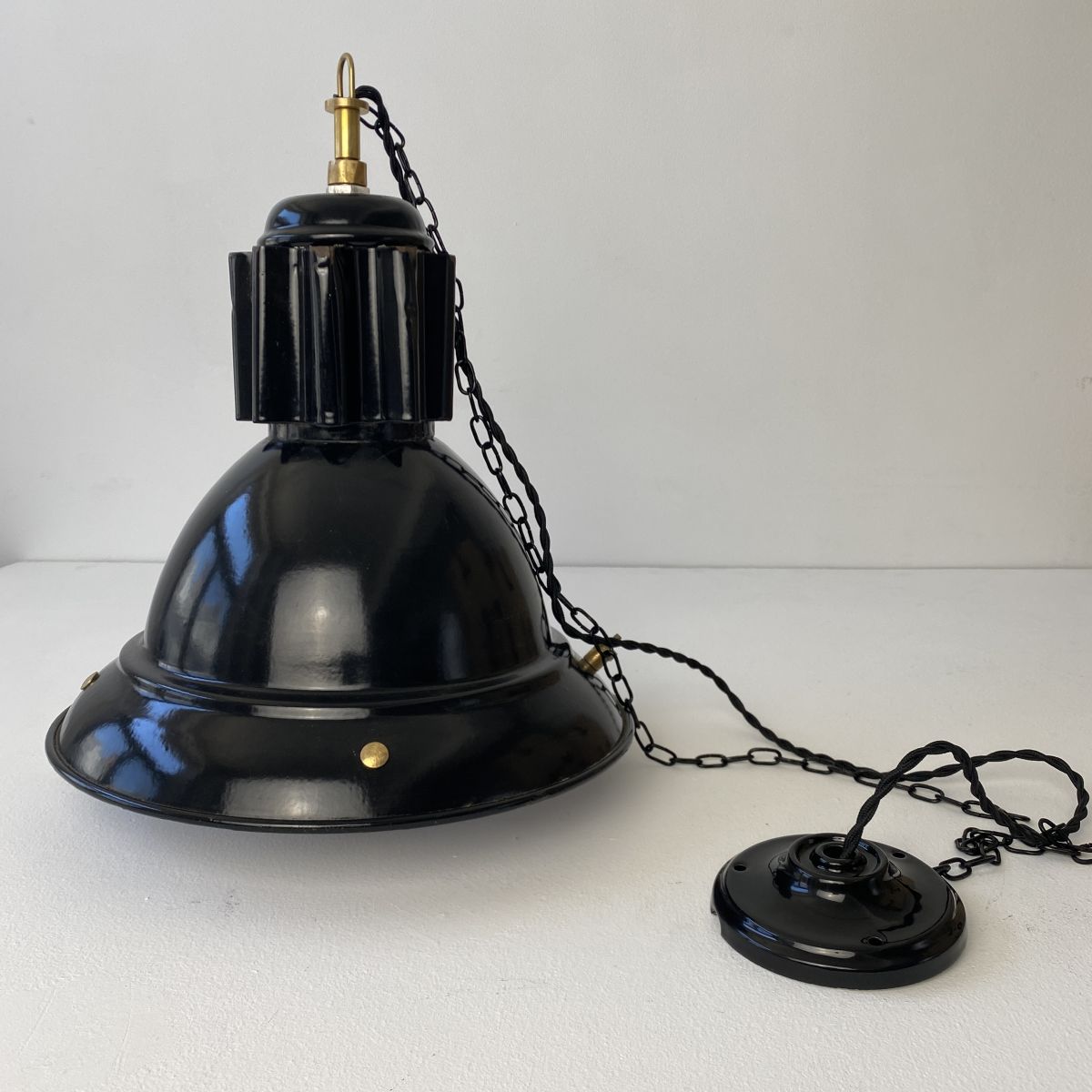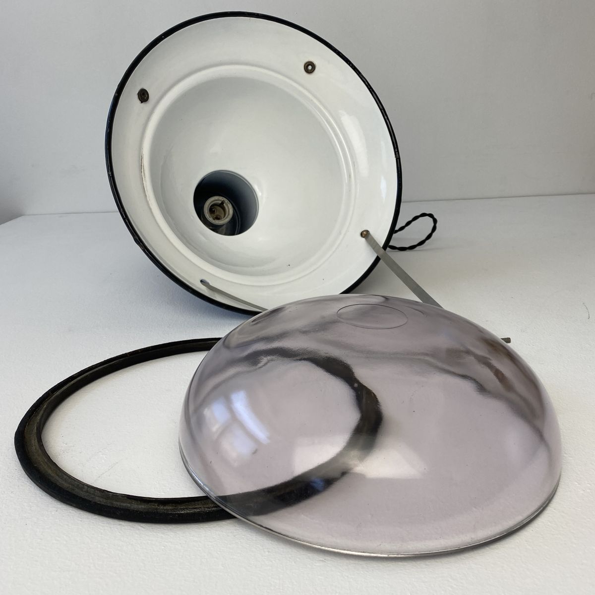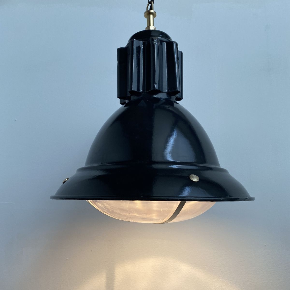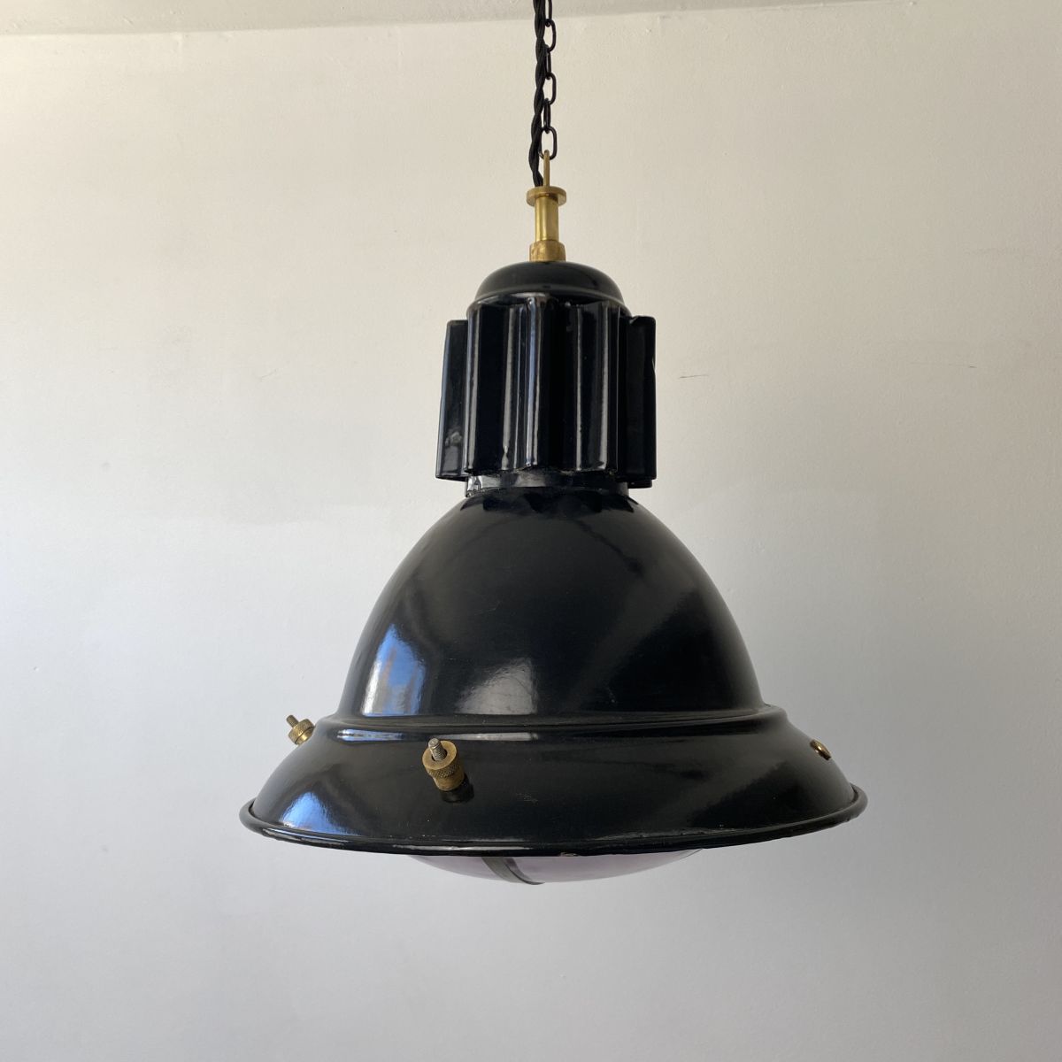 Superbe et rare suspension d’usine en tôle émaillée noire avec son dôme en verre retenu par 2 lamelles d’acier amovibles. Lumière douce.