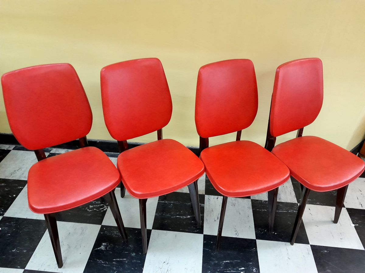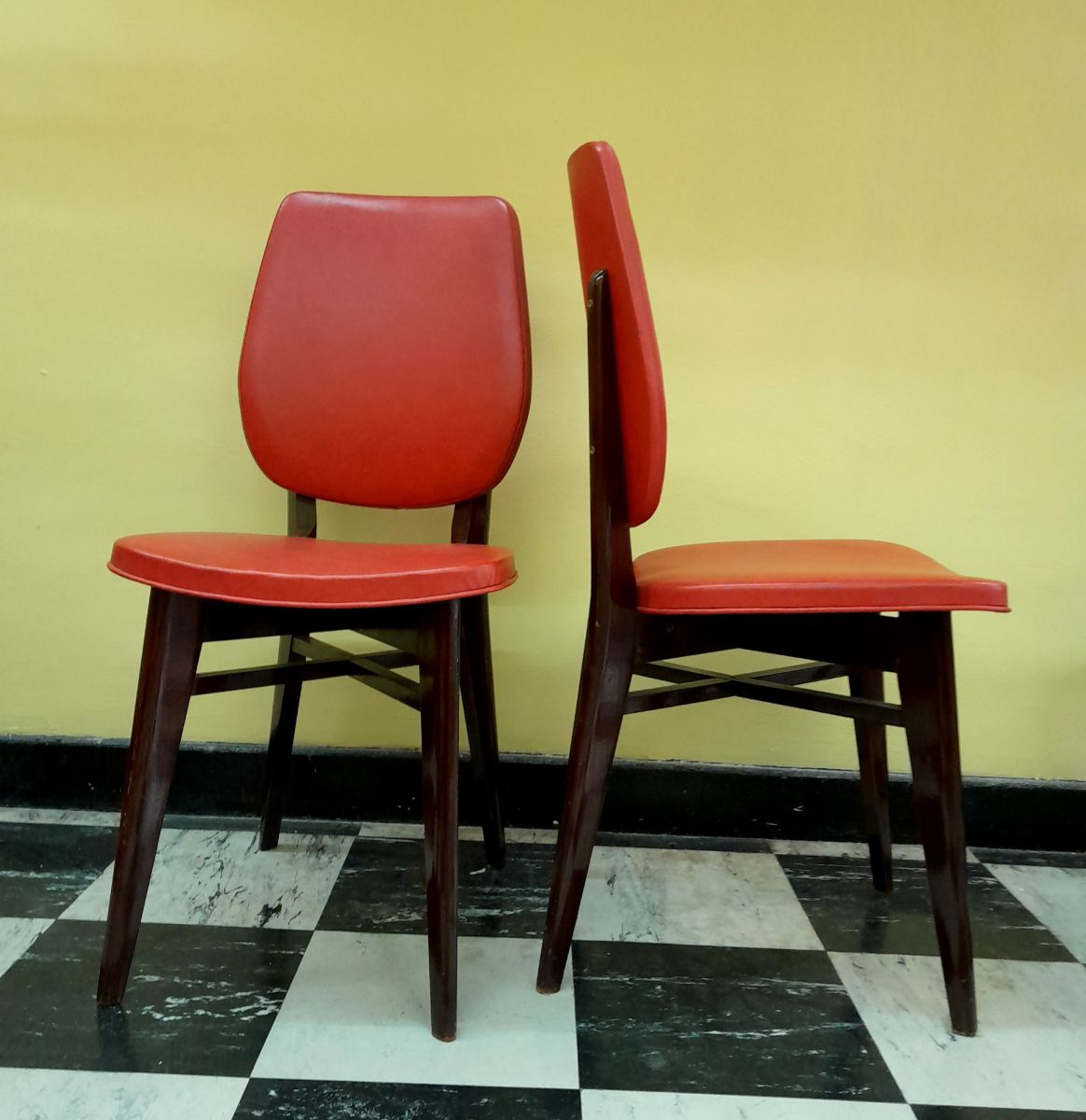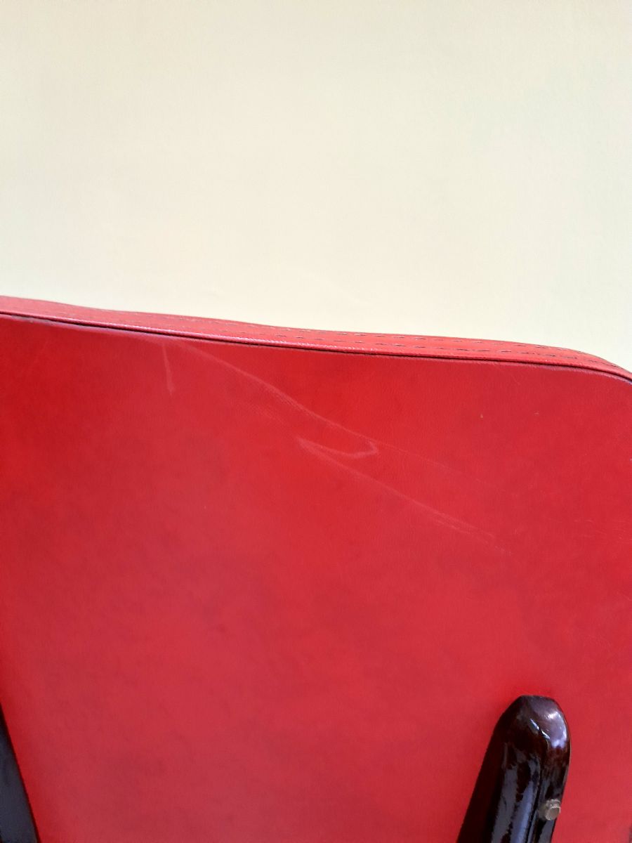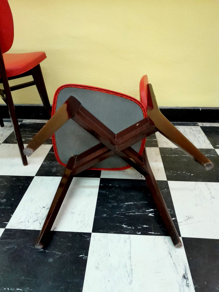Structure à croisillons en bois foncé style teck dossier et assise en skaï rouge.