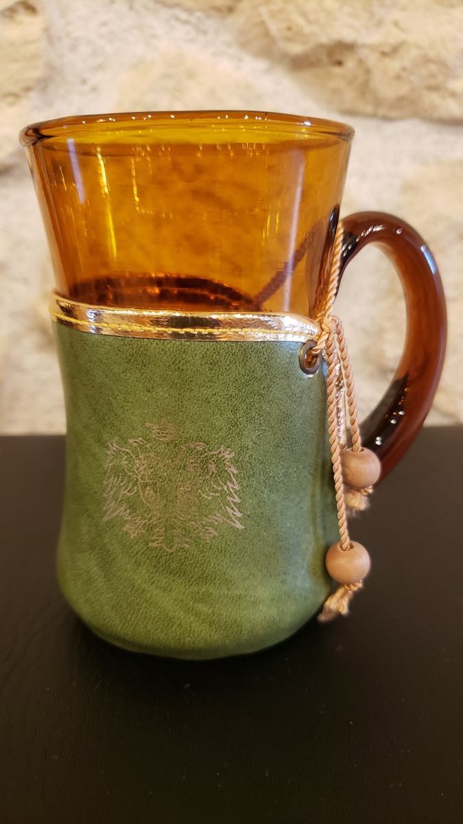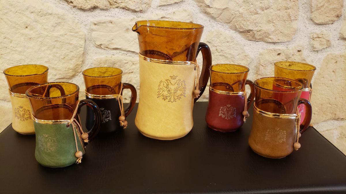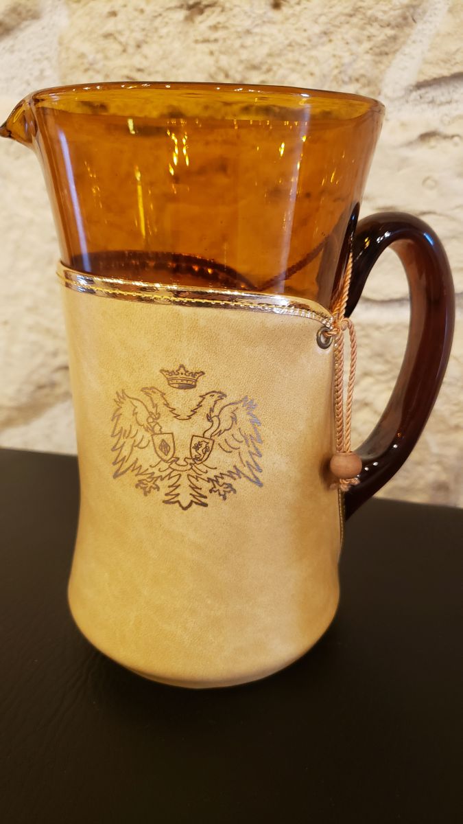 Joli service en verre ambré habillé d'une housse en cuir relié à l'anse avec un petit cordon. Les housses sont de différentes couleur et un blason y est apposé.