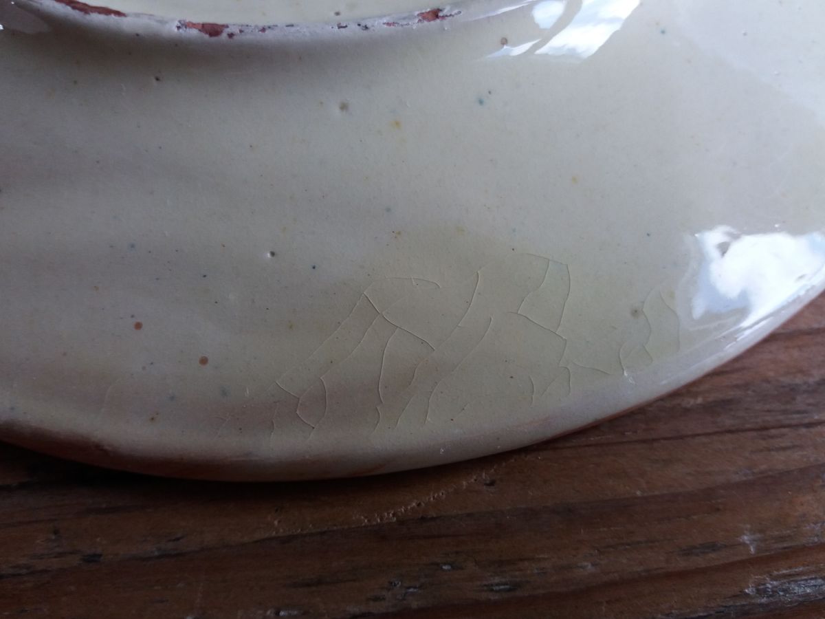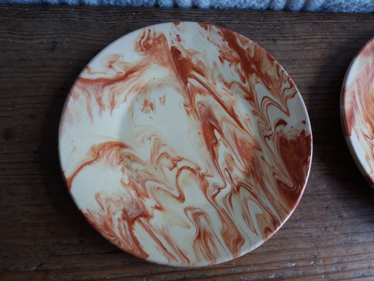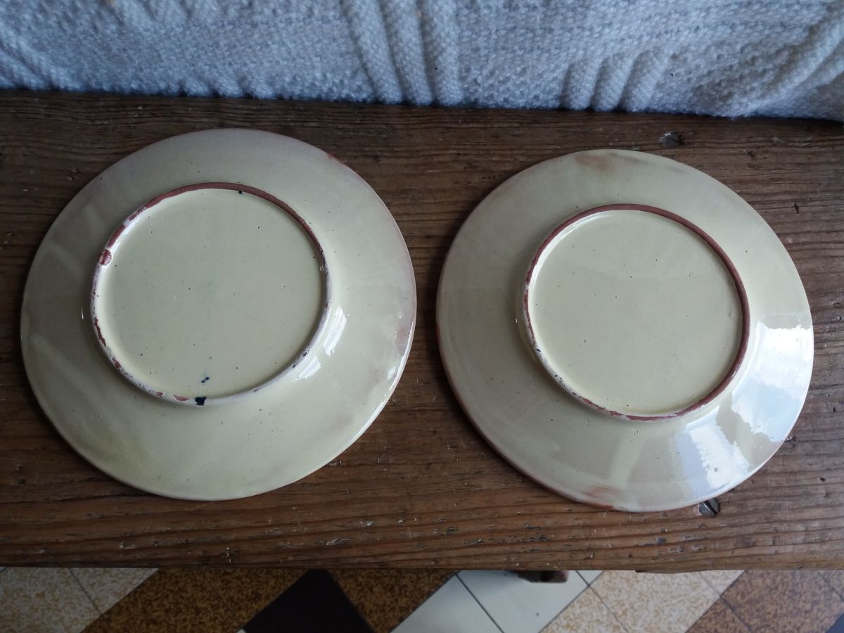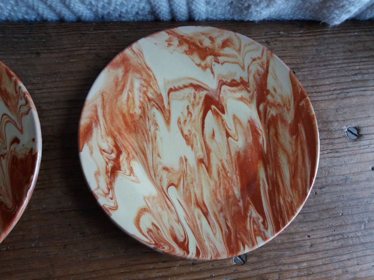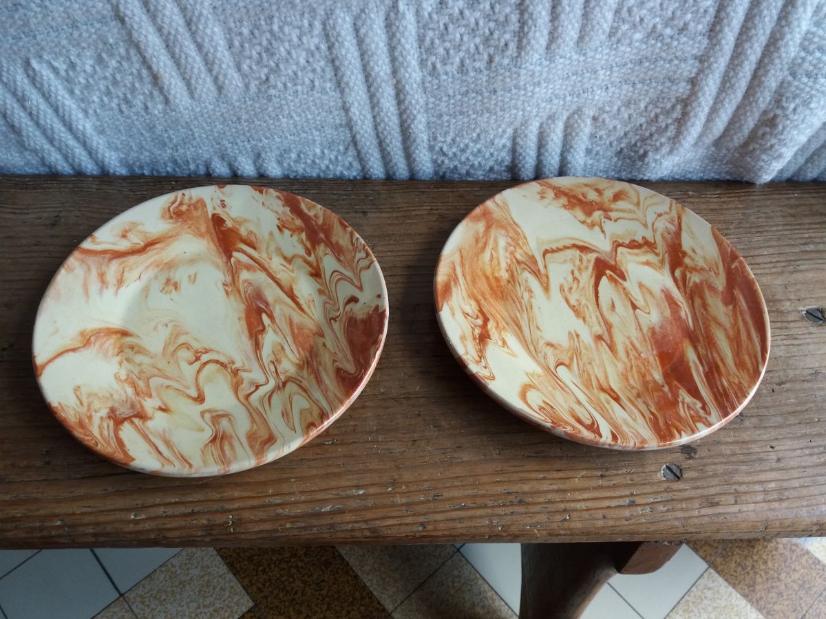 Ensemble de deux très jolies assiettes, au fort potentiel décoratif, en céramique avec un émaillage présentant de belles coulures de couleur orangé caramel rouille sur fond écru tirant sur le jaune. C’est un beau travail artisanal que je ne saurai dater mais elles ne doivent pas être toutes jeunes si on en croit les craquelures sur l’émaillage. Elles sont en bon état général, pas d’éclats, mais ne cachent pas leur âge : craquelures sur l’émaillage, marques diverses dont certaines d’origines (petites taches, marques et manques sur l’émaillage), rayures peu visibles, égrenures sur la base. Elles mesurent 20 cm de diamètre, 2, 5 cm de hauteur, et pèse chacune environ 440 g.